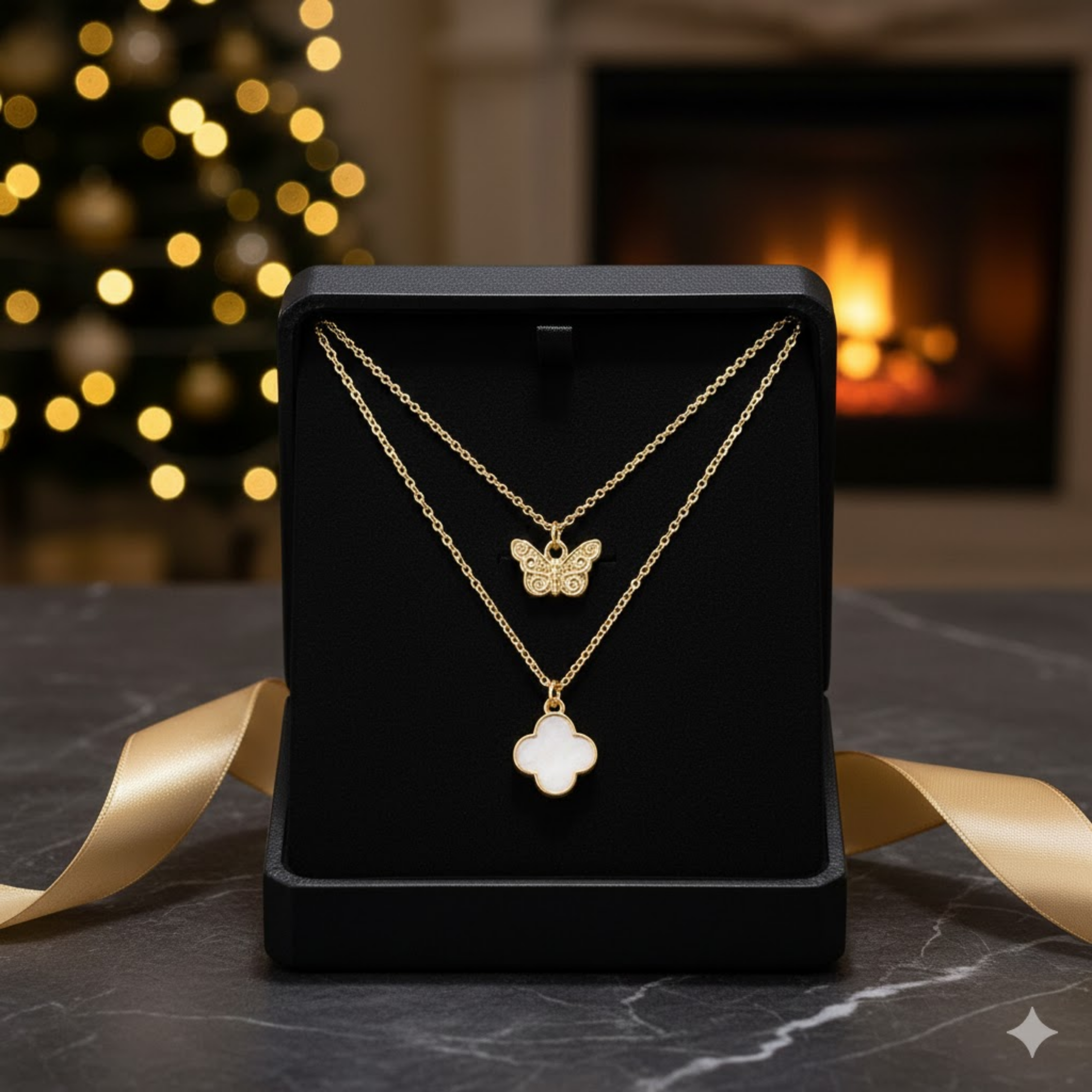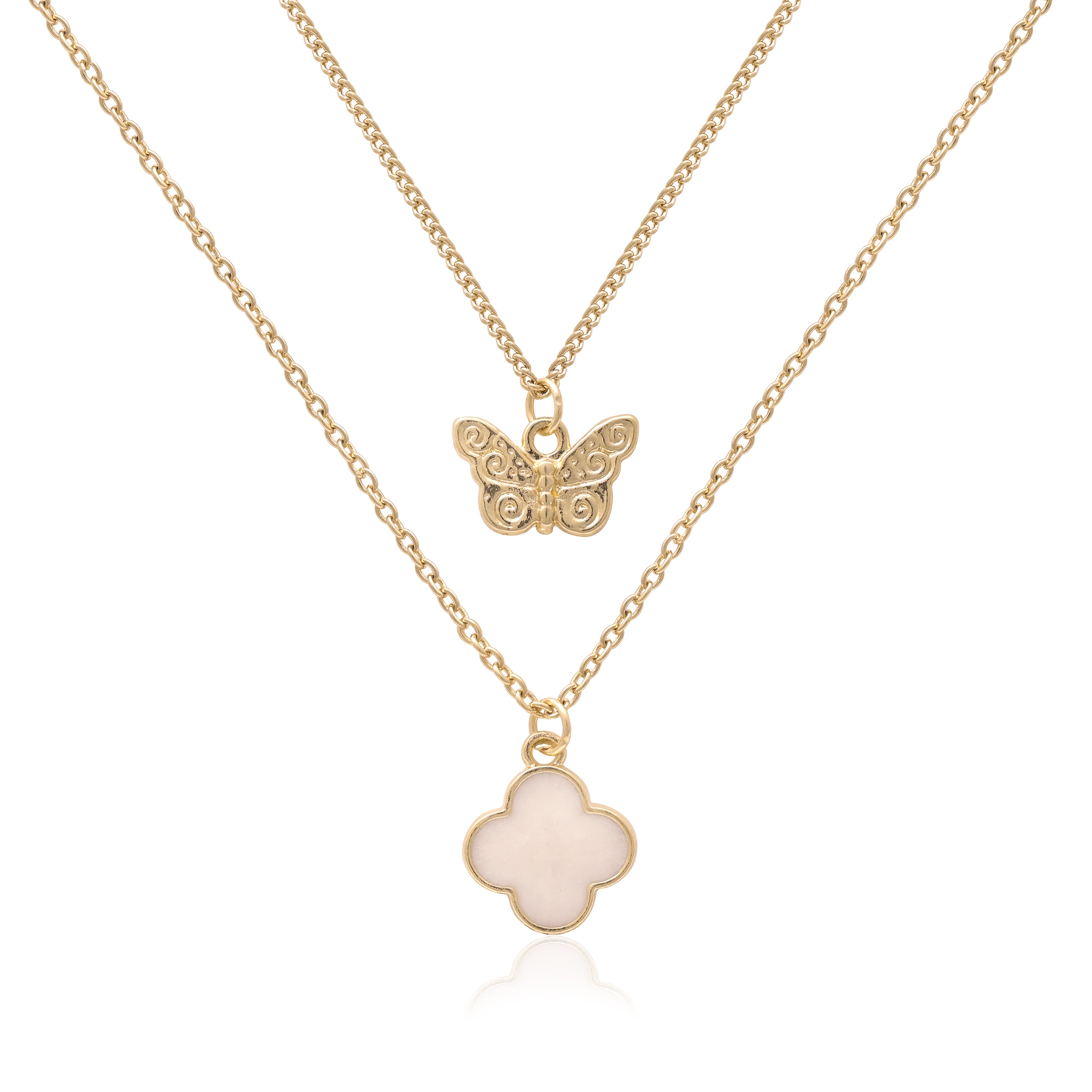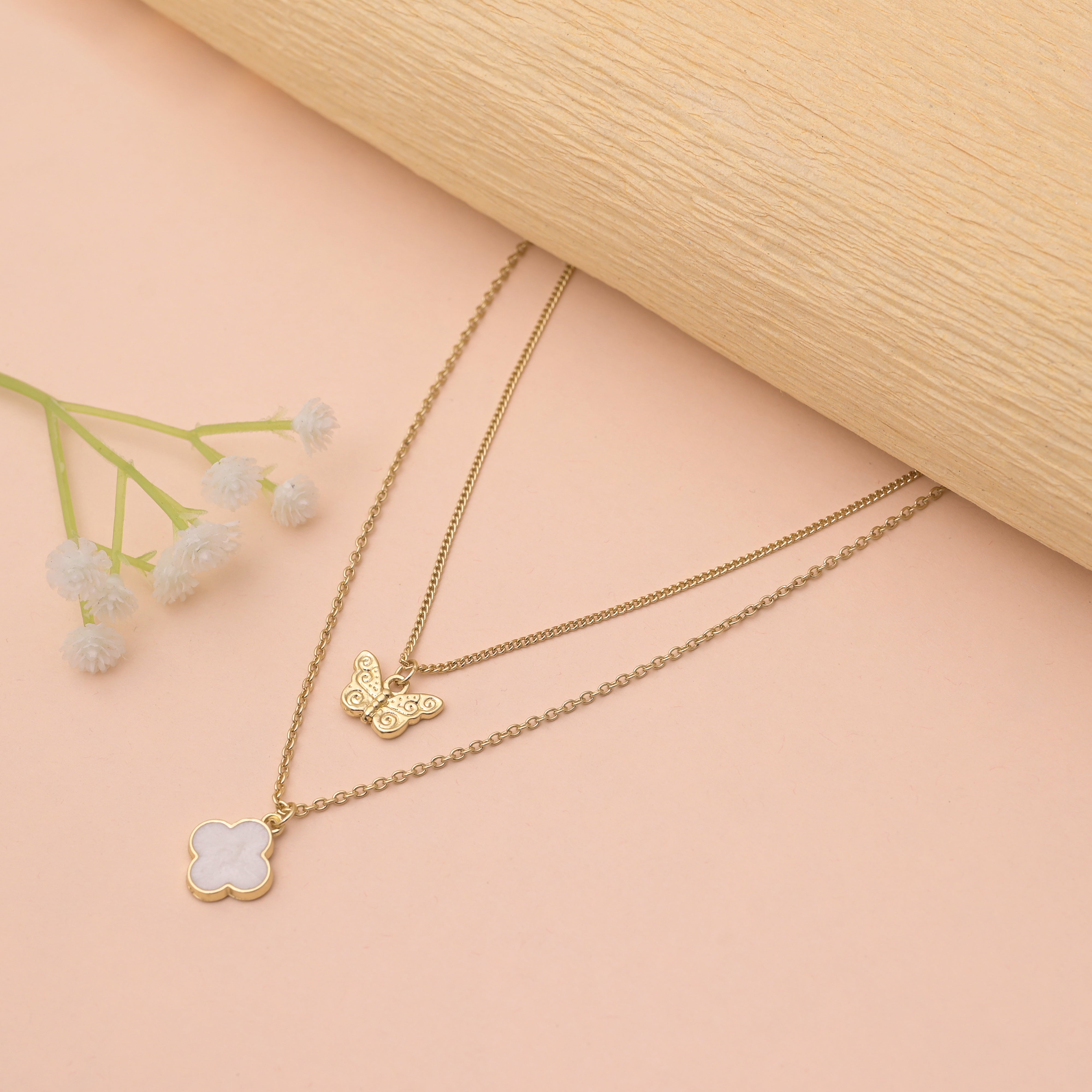 Add effortless elegance to your style with this gold plated layered necklace, featuring a delicate butterfly charm on the upper chain and a chic clover pendant on the lower chain. Designed with fine detailing and a polished finish, this necklace combines minimalism with a touch of sophistication.