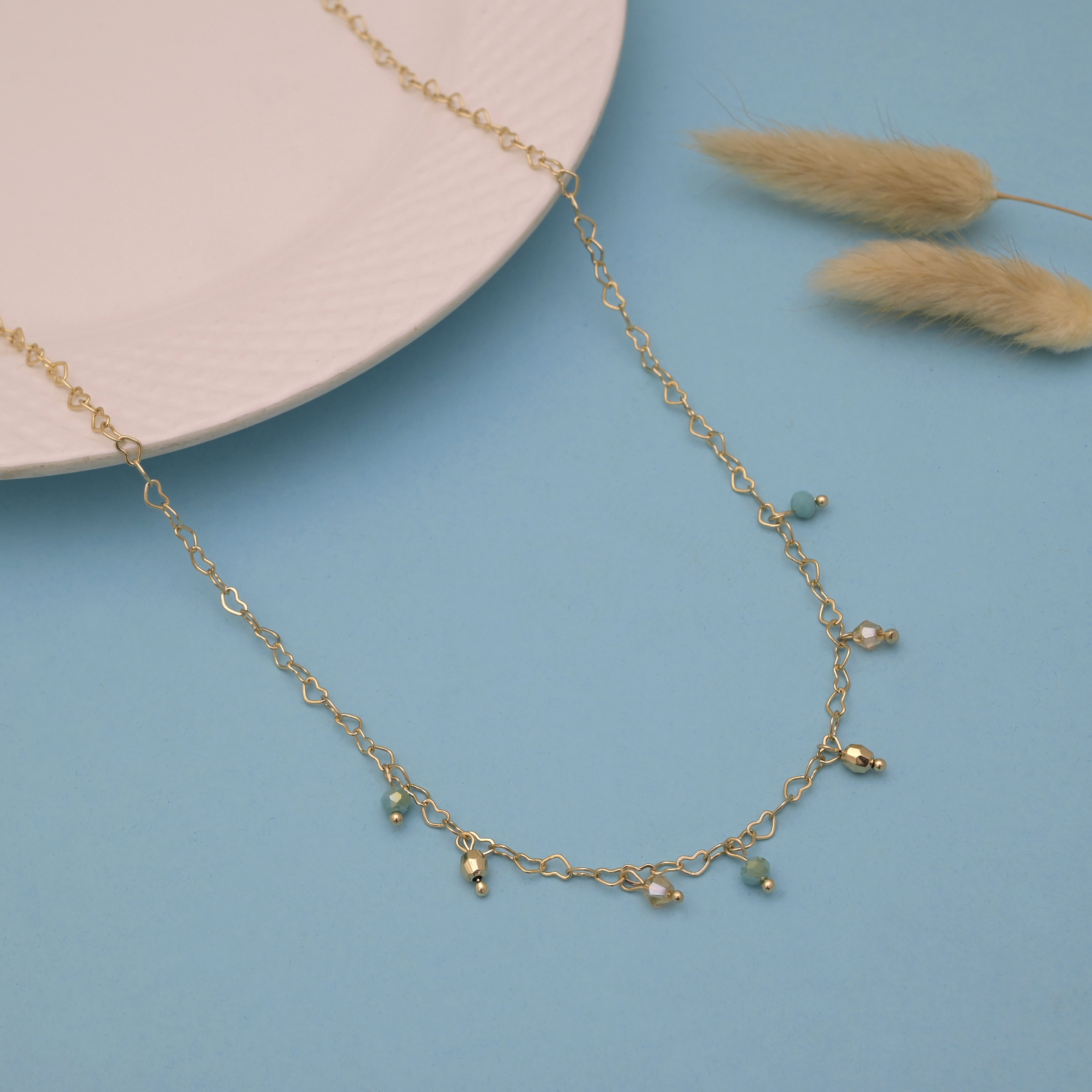 Add a playful yet elegant touch to your jewelry collection with this gold plated beaded chain necklace featuring delicate turquoise blue and champagne crystal charms. Designed on a lightweight, adjustable chain with a secure clasp, this necklace is perfect for layering or wearing as a subtle statement piece.