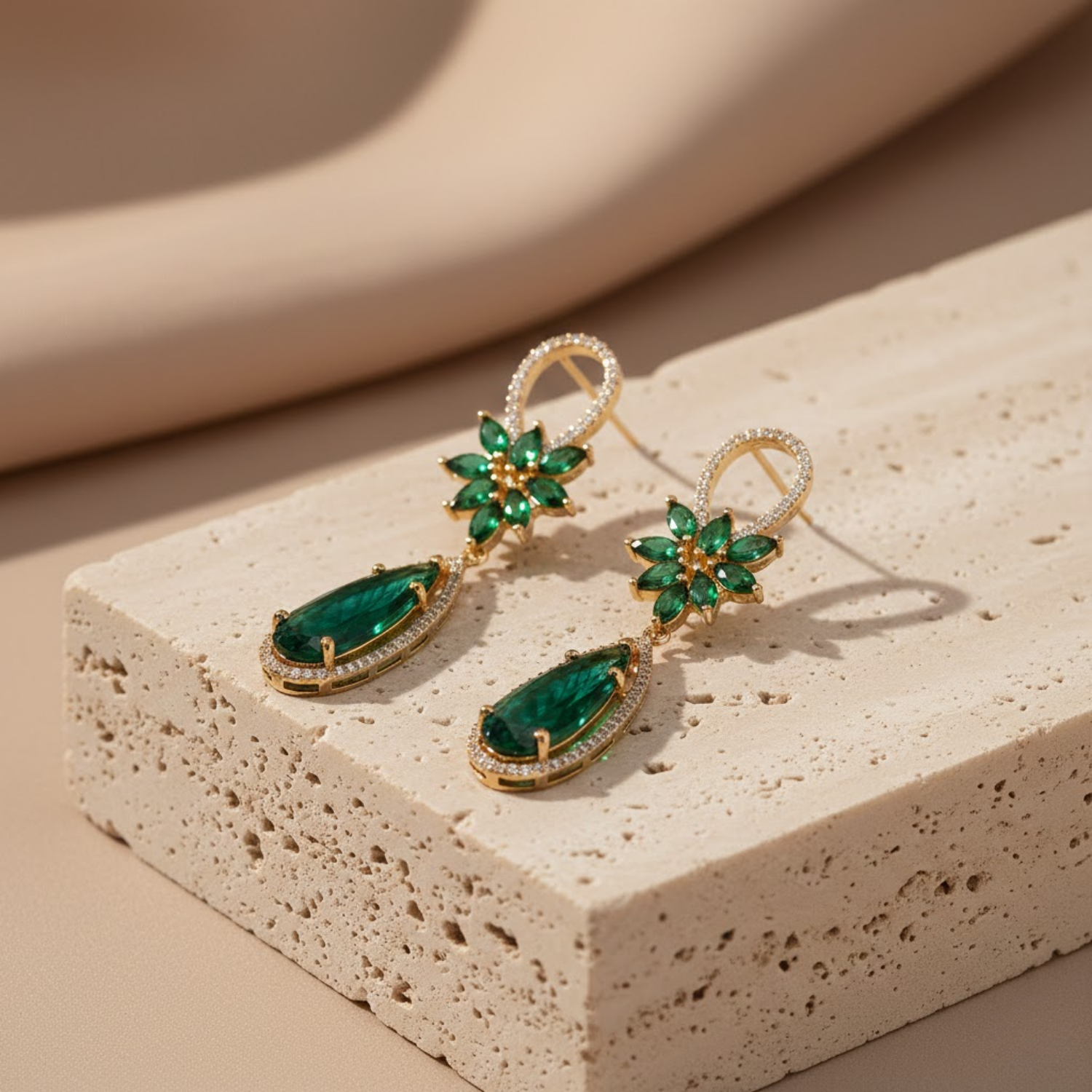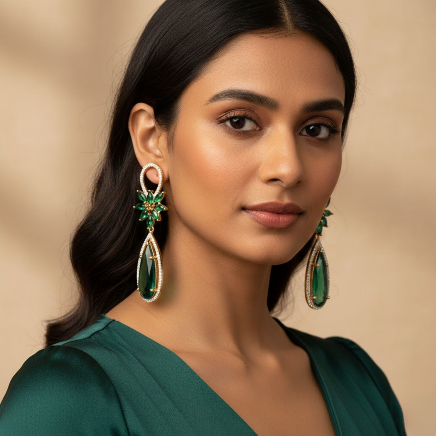 The Design Transitions Into A Stunning Teardrop Drop Featuring A Magnificent Pear Cut Emerald Green Centerpiece Secured In A Precision Prong Setting. The Frame Is Meticulously Pavé Set With Numerous Shimmering Diamond Color Cubic Zirconia Stones To Create A Continuous Surface Of Dazzling Sparkle. These New Arrival Drop Earrings Are Designed To Be A Bold Statement Piece For Your Jewelry Collection Or A Meaningful Gift For Someone Special. The Elegant Nature Inspired Aesthetic Complements Both Festive Ethnic Wear And Contemporary Evening Attire. Despite Their Detailed Craftsmanship And Intensive Stone Work These Earrings Are Engineered To Be Lightweight And Comfortable For All Day Wear.