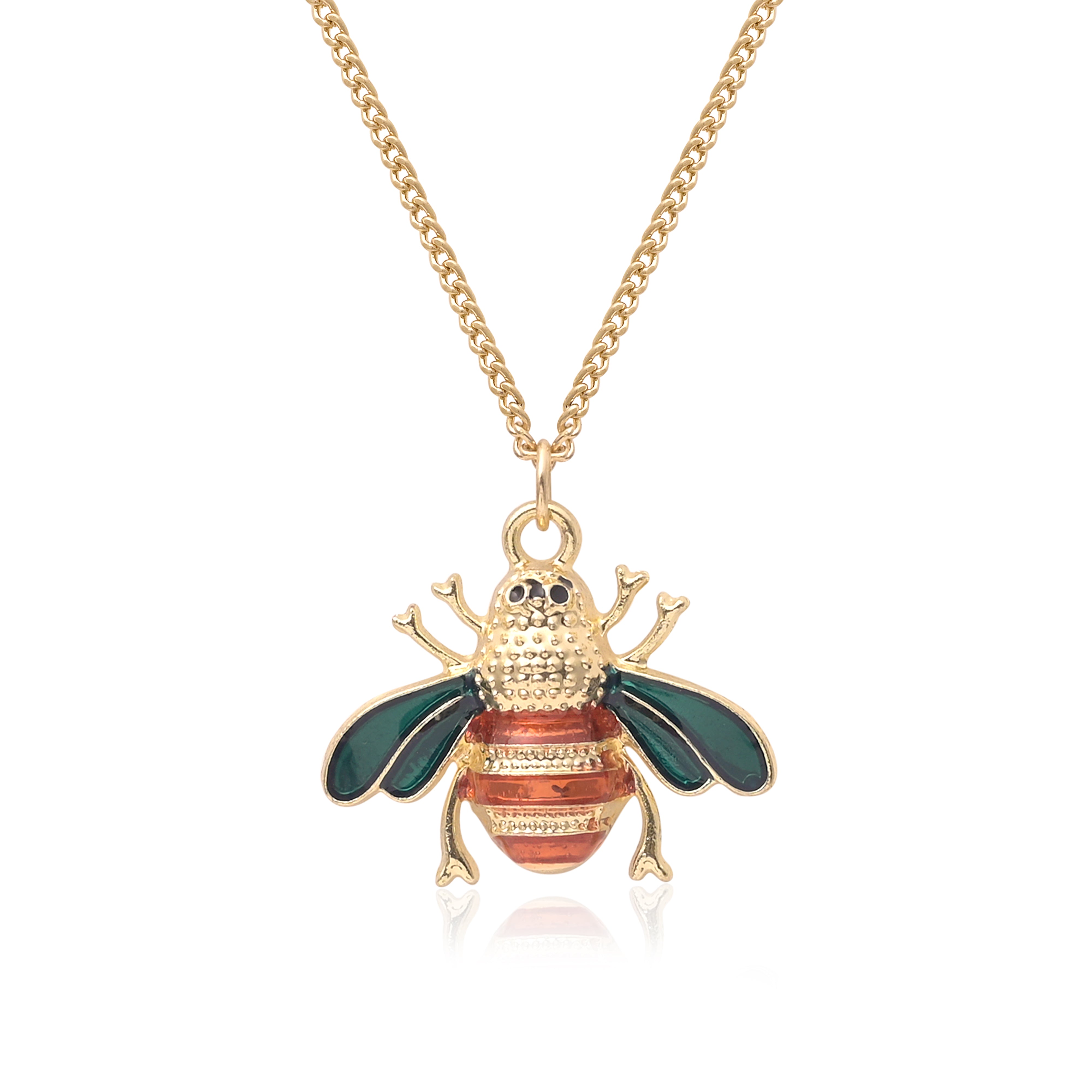 Bring a buzz of style to your jewelry collection with this gold plated enamel bee pendant necklace. Featuring a beautifully detailed bee design with green enamel wings and a striped golden-orange body, this playful pendant adds a touch of nature-inspired charm to any outfit.