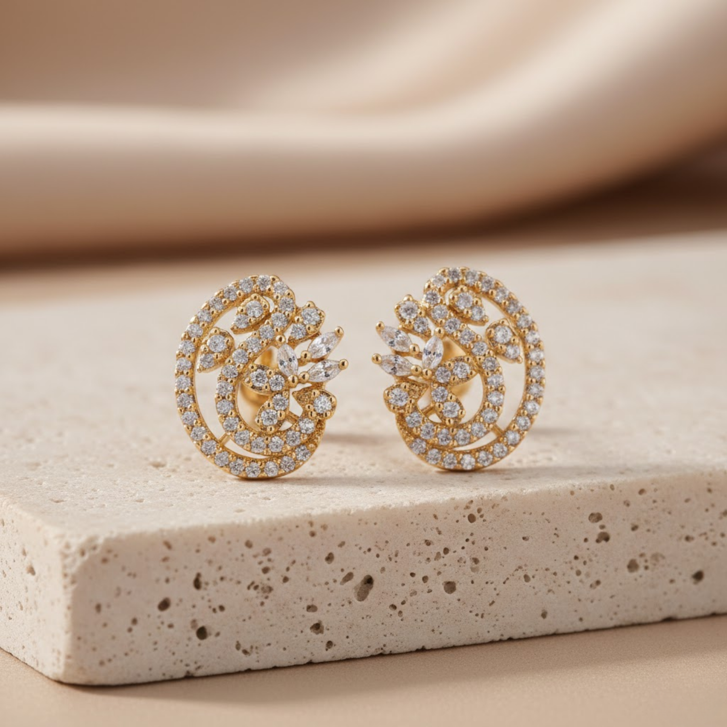 Grace Your Ears With The Unmatched Brilliance Of These Alluringly Crafted Golden Brass Stud Earrings From 2wist Designs. This Modern Masterpiece Is Made From High Quality Brass Metal With Premium Golden Plating Featuring A Sophisticated Floral Swirl Silhouette. The Design Showcases An Intricate Openwork Pattern Meticulously Set With Numerous Shimmering Diamond Color Cubic Zirconia Stones In Both Round and Marquise Cuts To Capture The Light From Every Angle.