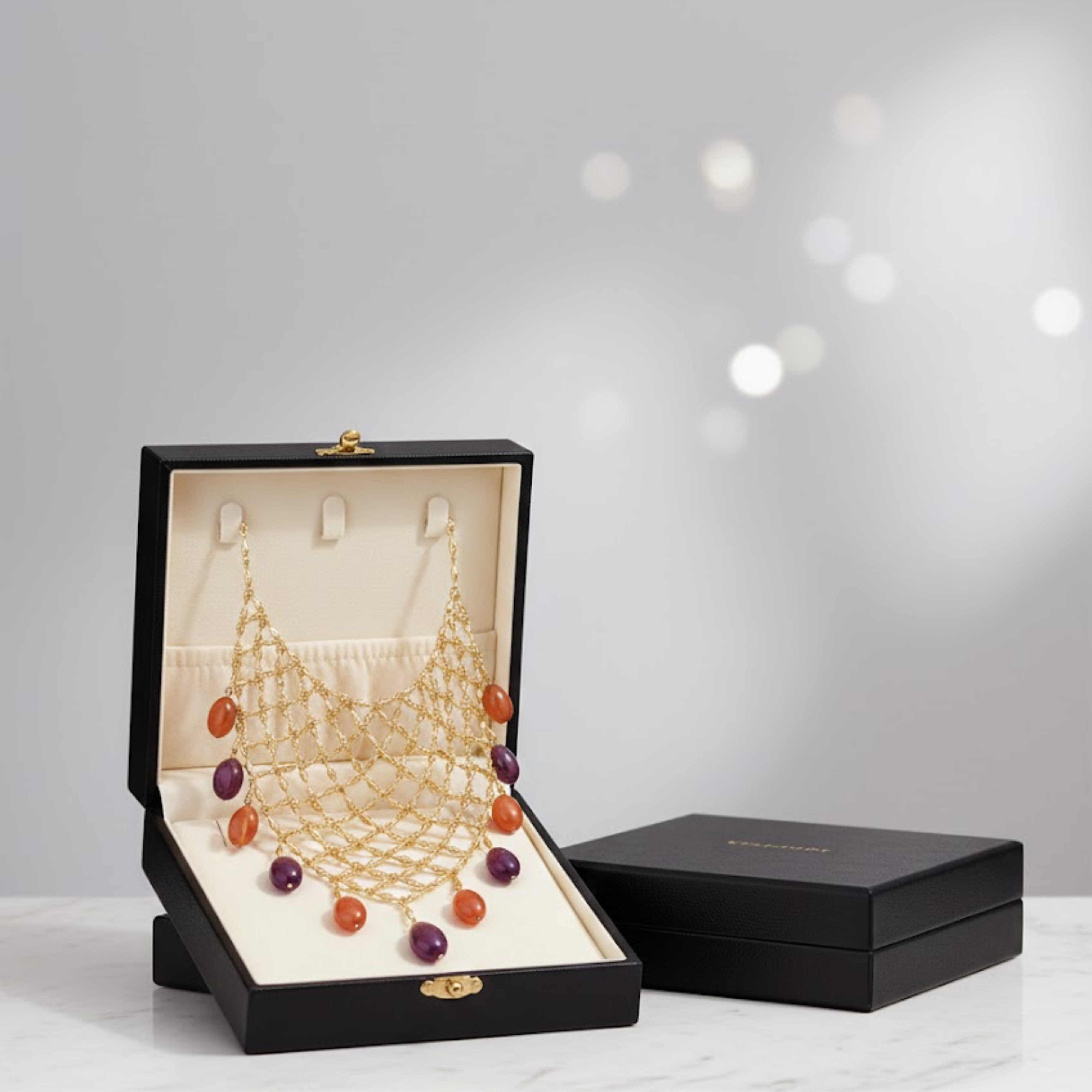 Β Make a grand entrance with this exquisite Gold Toned Mesh Statement Necklace. This piece features an intricate web of... Read more