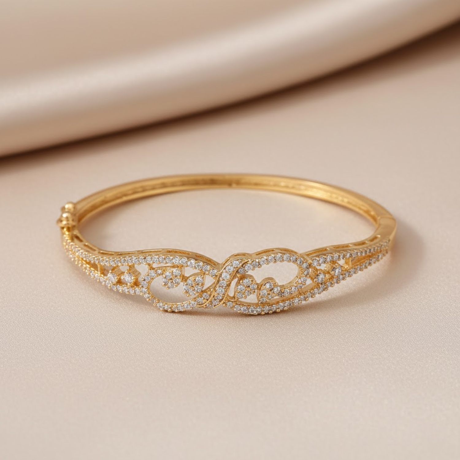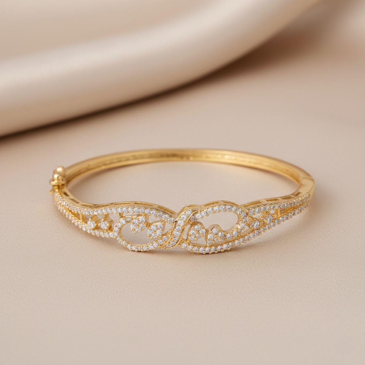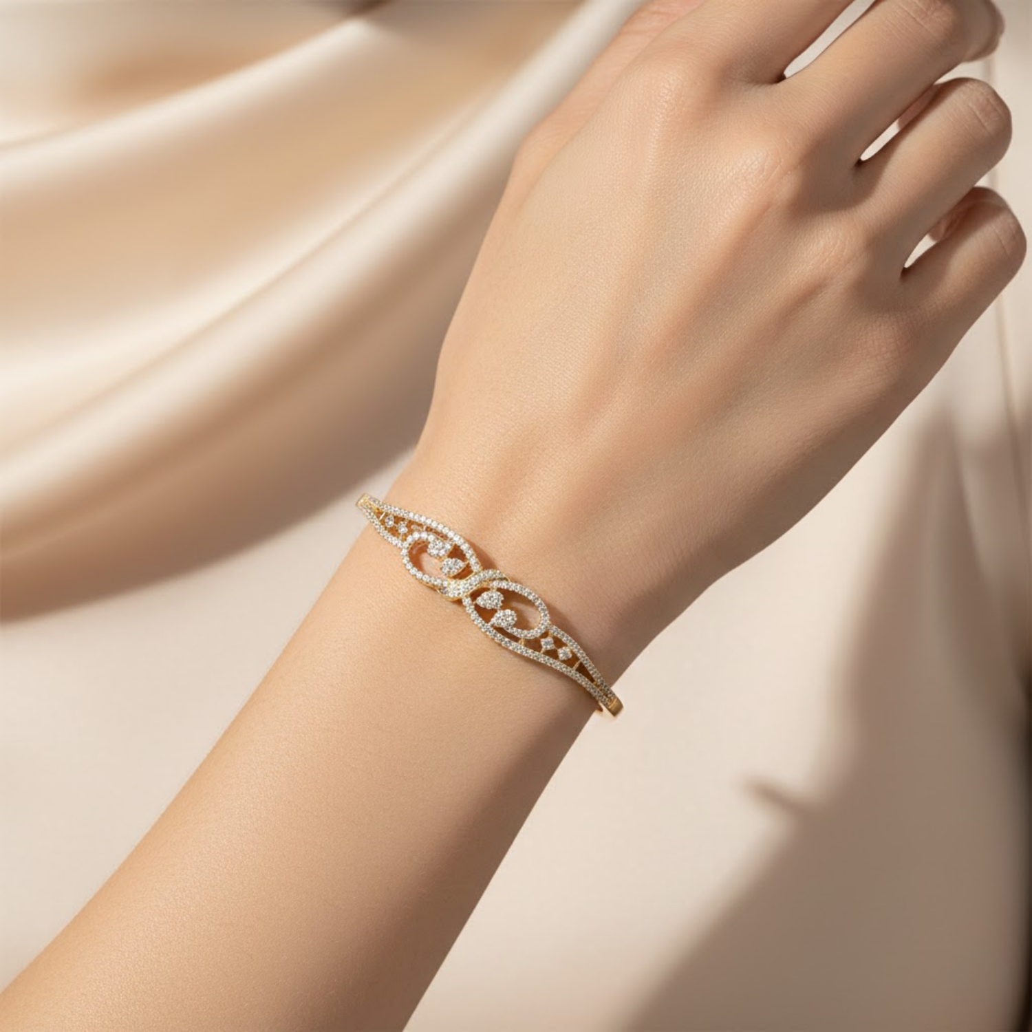 Enhance your wrist with this exquisitely crafted bangle that blends a rich golden radiance with the timeless brilliance of round-cut... Read more