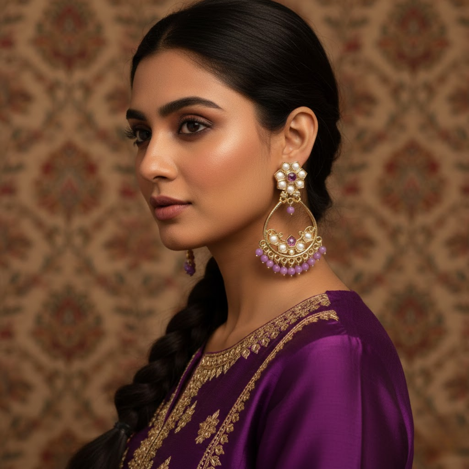 The Lower Half Of Each Earring Is Adorned With A Delicate Fringe Of Lavender Color Beaded Dangles That Create A Beautiful Sway With Every Movement. These New Arrival Earrings Are Perfect For Weddings Festive Occasions Or Adding A Touch Of Royal Sophistication To Your Ethnic Wardrobe. Despite Their Ornate And Substantial Appearance These Earrings Are Engineered To Be Lightweight And Comfortable For Long Duration Wear. Whether You Are Looking For A Meaningful Gift Or A New Hero Piece For Your Own Collection These Lavender And White Stone Earrings Offer A High End Contemporary Aesthetic That Customers Value For Its Fine Craftsmanship.