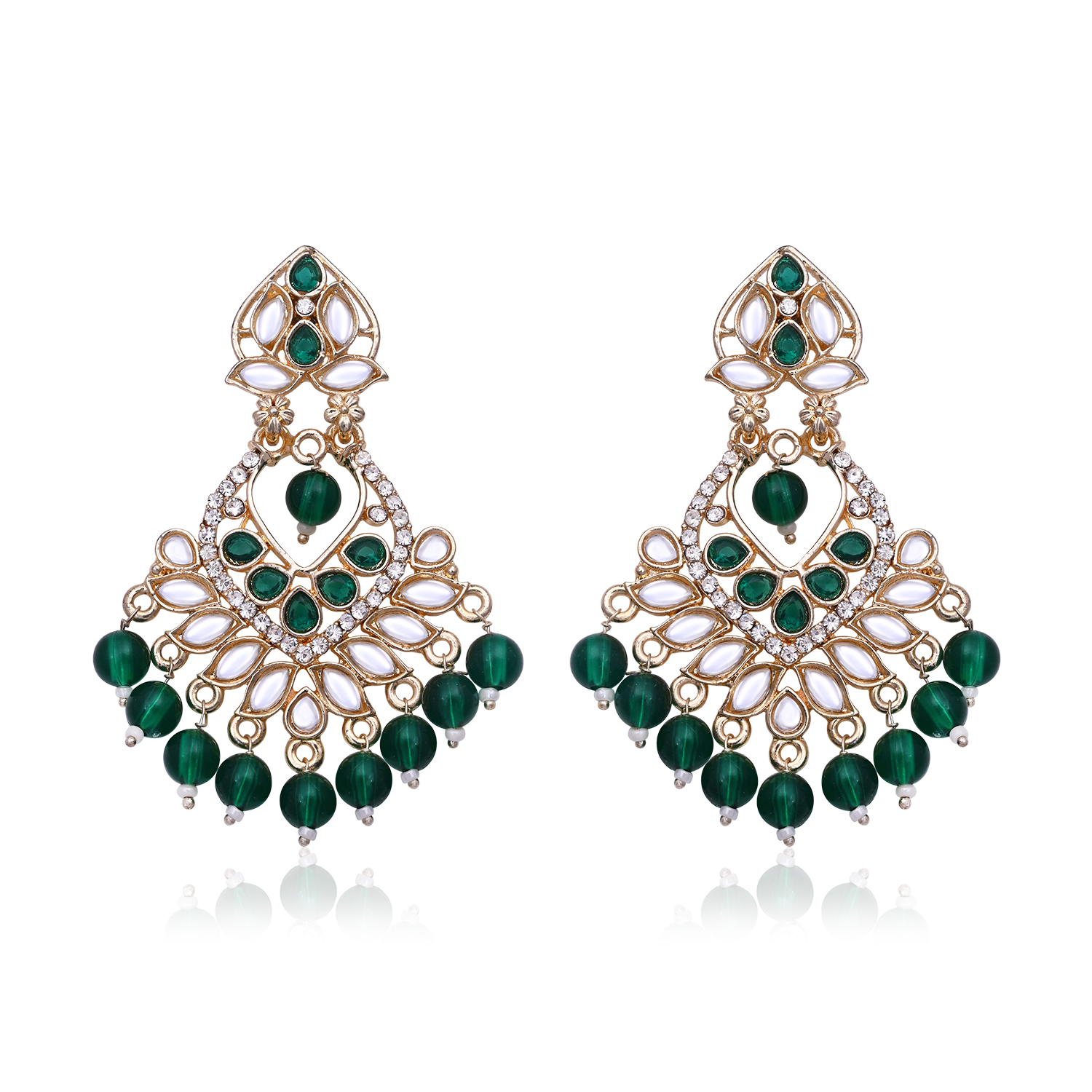 Illuminate Your Festive Look With These Exquisitely Crafted Dazzling Earrings From 2wist Designs. These Statement Earrings Are Made From High Quality Brass Metal With Premium Golden Plating Featuring A Classic Chandbali Silhouette. The Design Is Intricately Set With Shimmering White Color Stones In A Radiant Floral Pattern And Adorned With Vibrant Emerald Green Color Stone Accents And Matching Green Beaded Dangles.