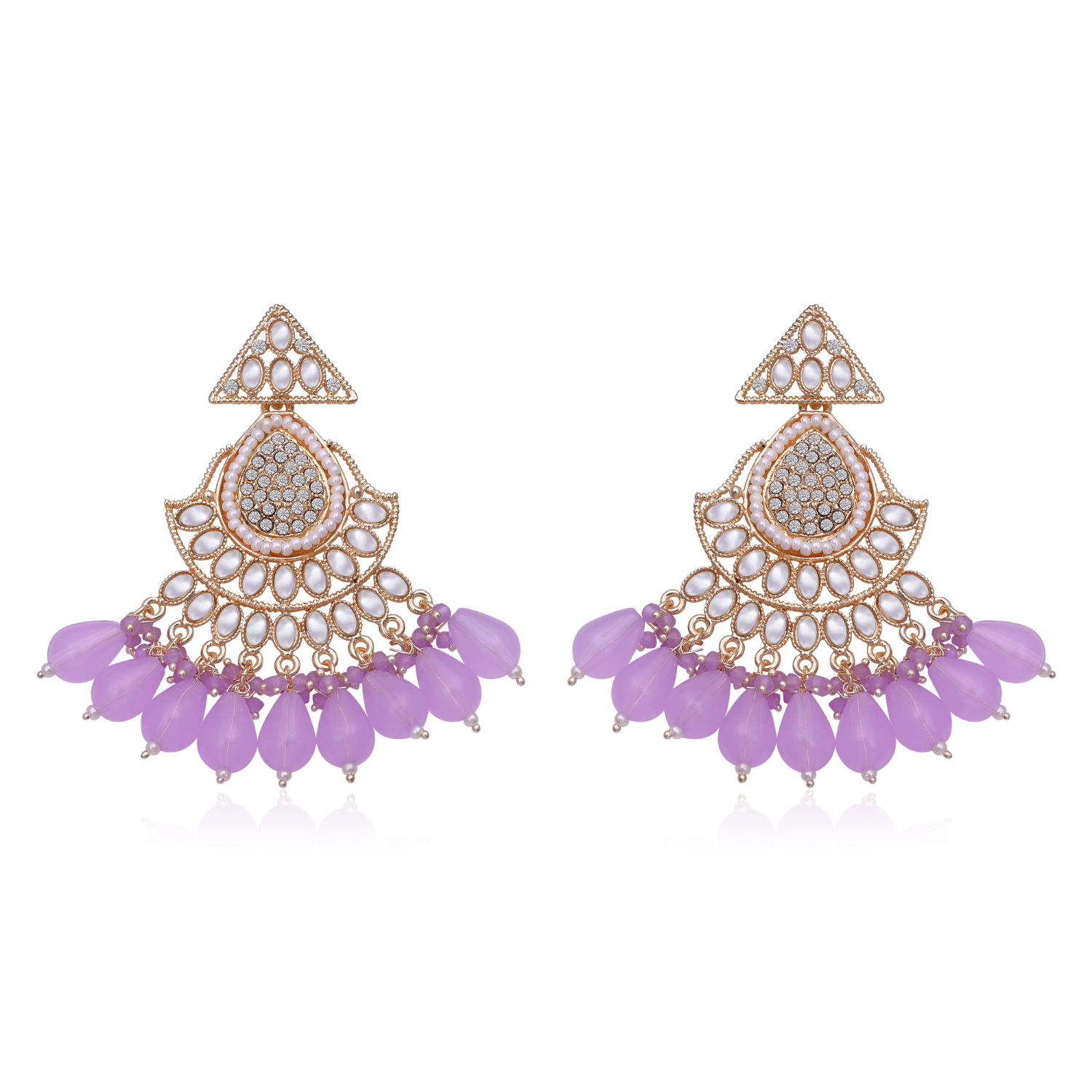 Brighten Your Ethnic Wardrobe With These Exquisitely Crafted Radiant Earrings From 2wist Designs. These Statement Earrings Are Made From High Quality Brass Metal With Premium Golden Plating Featuring A Modern Triangular Stud And A Graceful Fan Shaped Silhouette. The Design Is Intricately Set With Shimmering White Color Stones In A Floral Pattern And Adorned With Vibrant Lavender Color Stone Dangles.