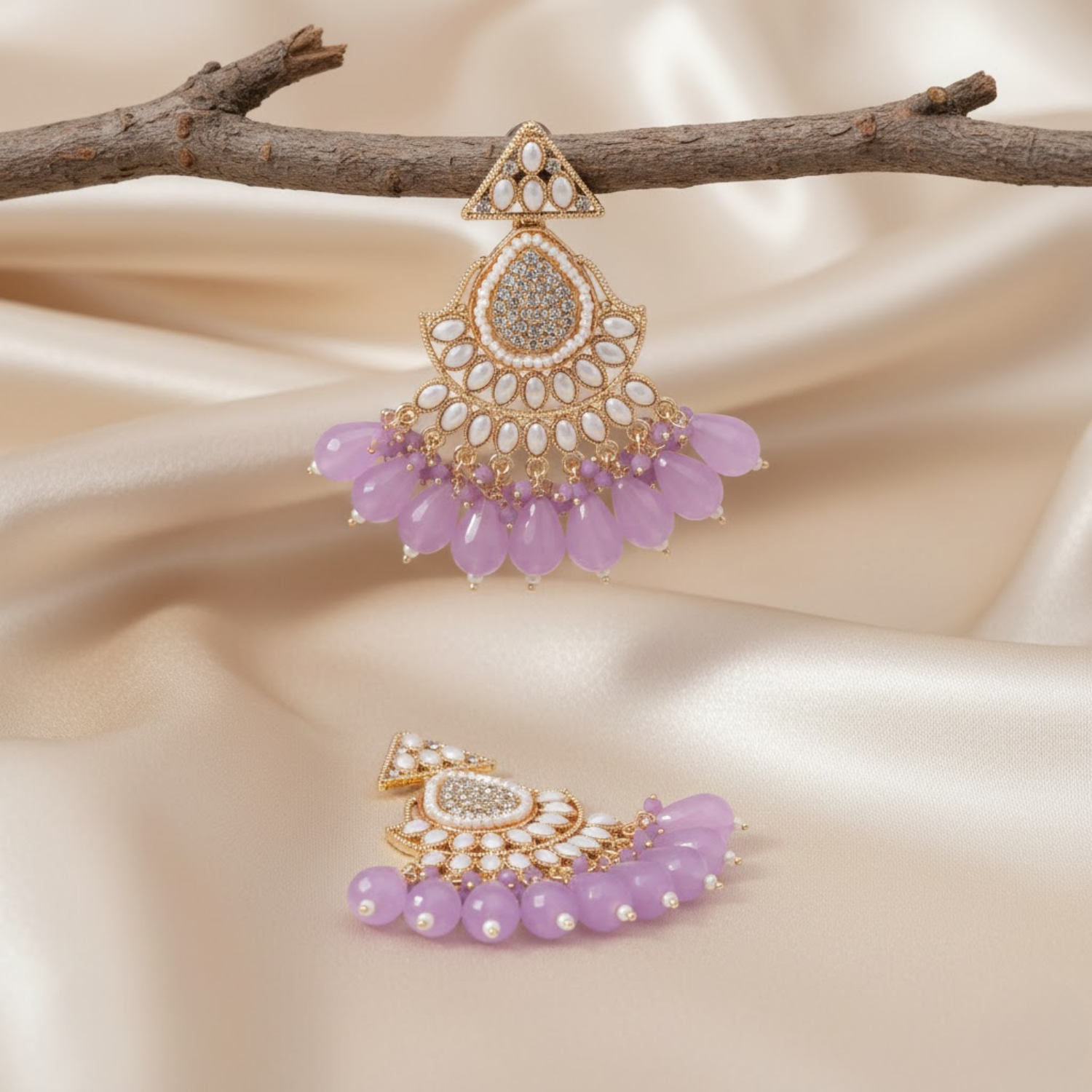 These Traditional Earrings Are Perfect For Weddings Festive Occasions Or Adding A Touch Of Royal Sophistication To Your Ethnic Wardrobe. The Detailed Metal Work And Radiant Golden Finish Create A Sophisticated Traditional Look That Complements Any Indian Attire Beautifully. Despite Their Ornate And Substantial Appearance These Earrings Are Engineered To Be Lightweight And Comfortable For Long Duration Wear. Whether You Are Looking For A Meaningful Gift Or A New Hero Piece For Your Own Collection These Lavender And White Stone Earrings Offer A High End Contemporary Aesthetic That Customers Value For Its Fine Craftsmanship.