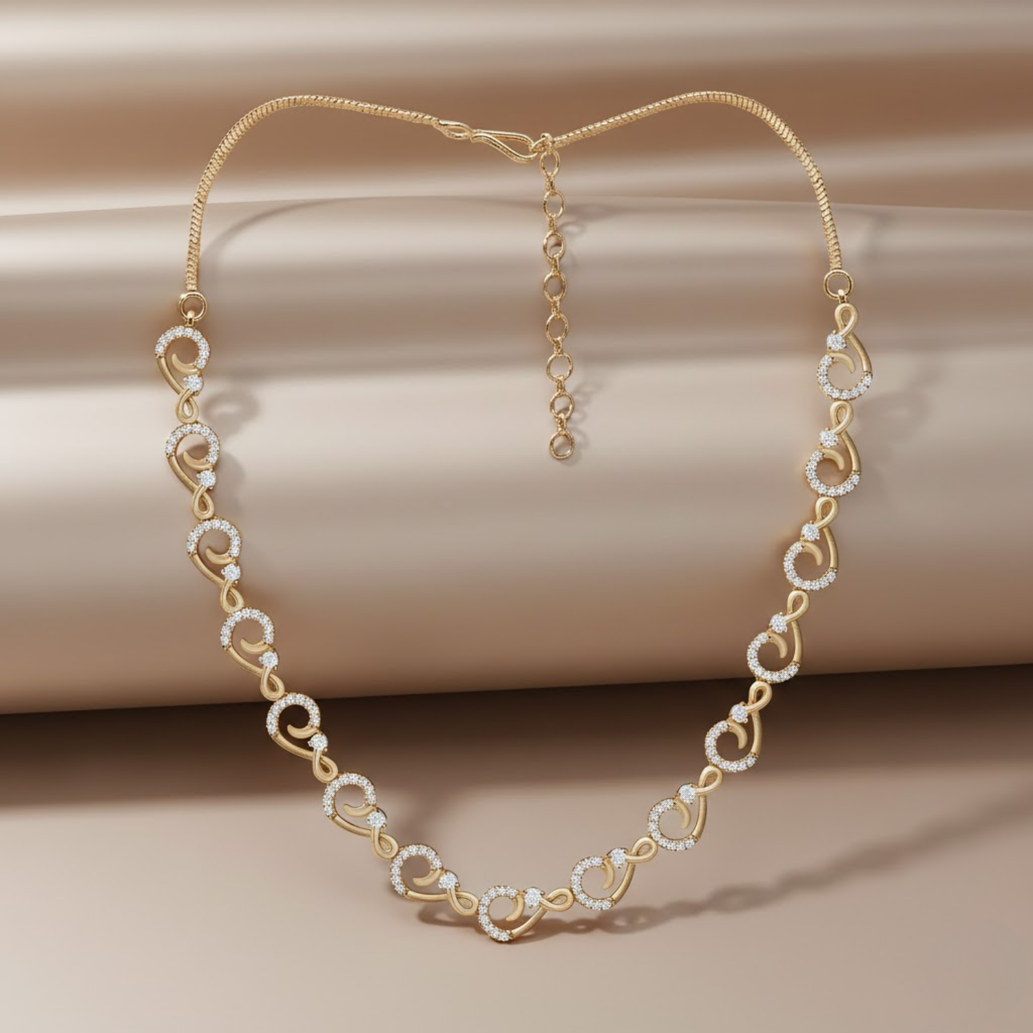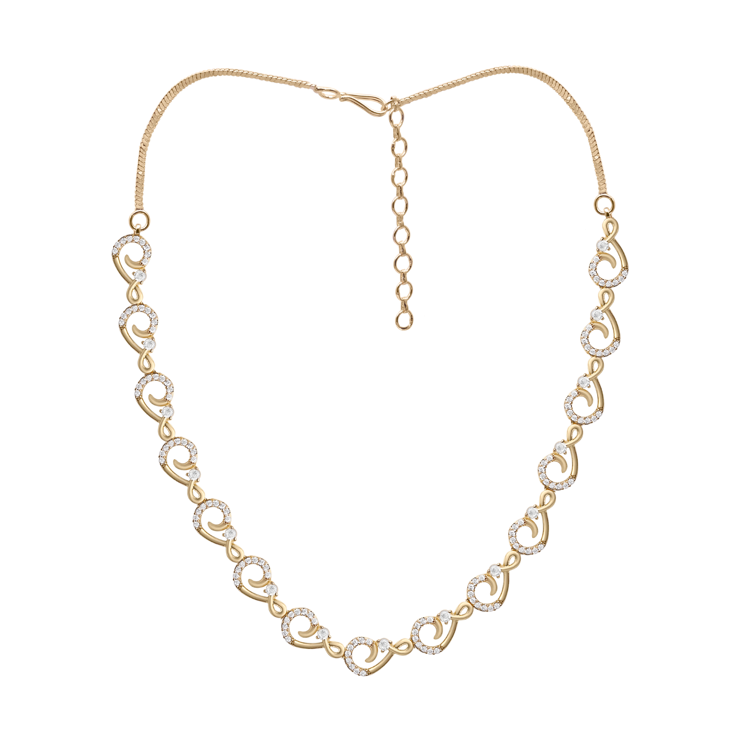 Grace Your Neckline With The Unmatched Brilliance Of This Breathtakingly Crafted Golden Brass Necklace From 2wist Designs. This Modern Masterpiece Is Made From High Quality Brass Metal With Premium Golden Plating Featuring A Sophisticated Sequence Of Elegant Paisley Scroll Motifs. The Design Is Meticulously Set With Numerous Shimmering Diamond Color Cubic Zirconia Stones That Capture The Light To Create A Dazzling Surface Of Brilliance.