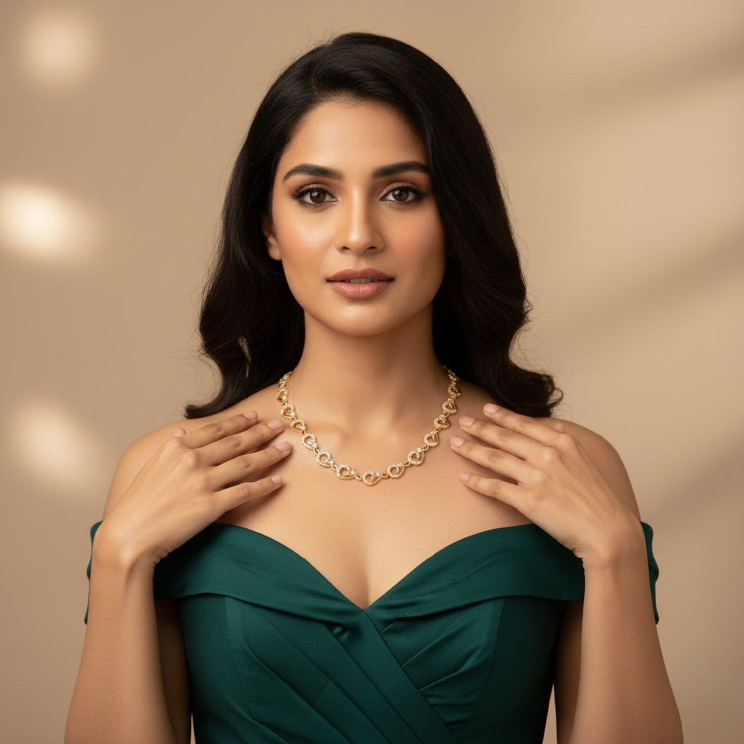 This New Arrival Necklace Is Designed To Be A Versatile Statement Piece For Your Jewelry Collection Or A Meaningful Gift For Someone Special. The Fluid Curved Design And Intricate Stone Work Offer A Modern Minimalist Aesthetic That Complements Both Festive Ethnic Wear And Contemporary Evening Attire. Despite Its Detailed Craftsmanship And Intensive Stone Work This Necklace Is Engineered To Be Lightweight And Comfortable For All Day Wear. Whether You Are Attending A Grand Celebration Or Looking For A New Hero Piece For Your Personal Style This Paisley Scroll Necklace Offers A High End Contemporary Aesthetic That Customers Value For Its Fine Craftsmanship.