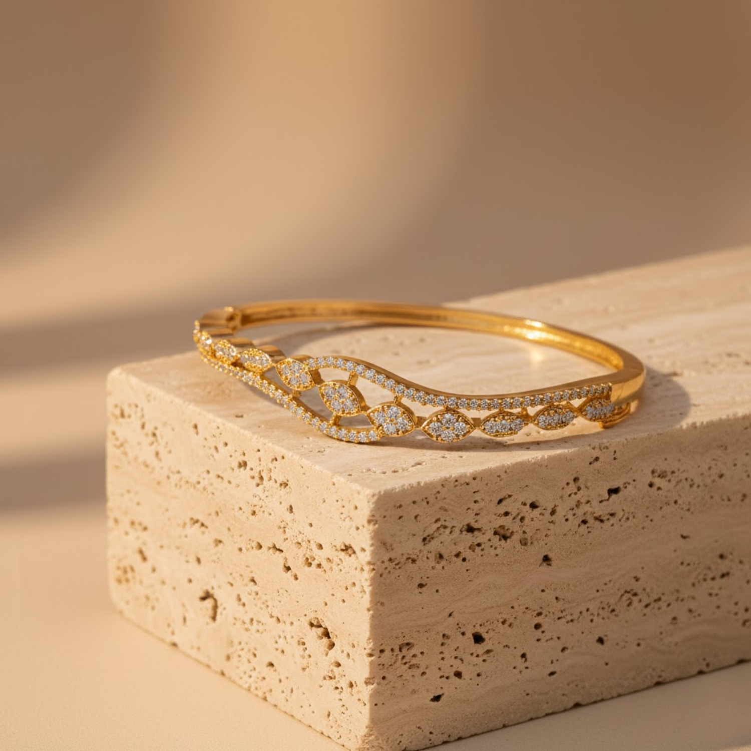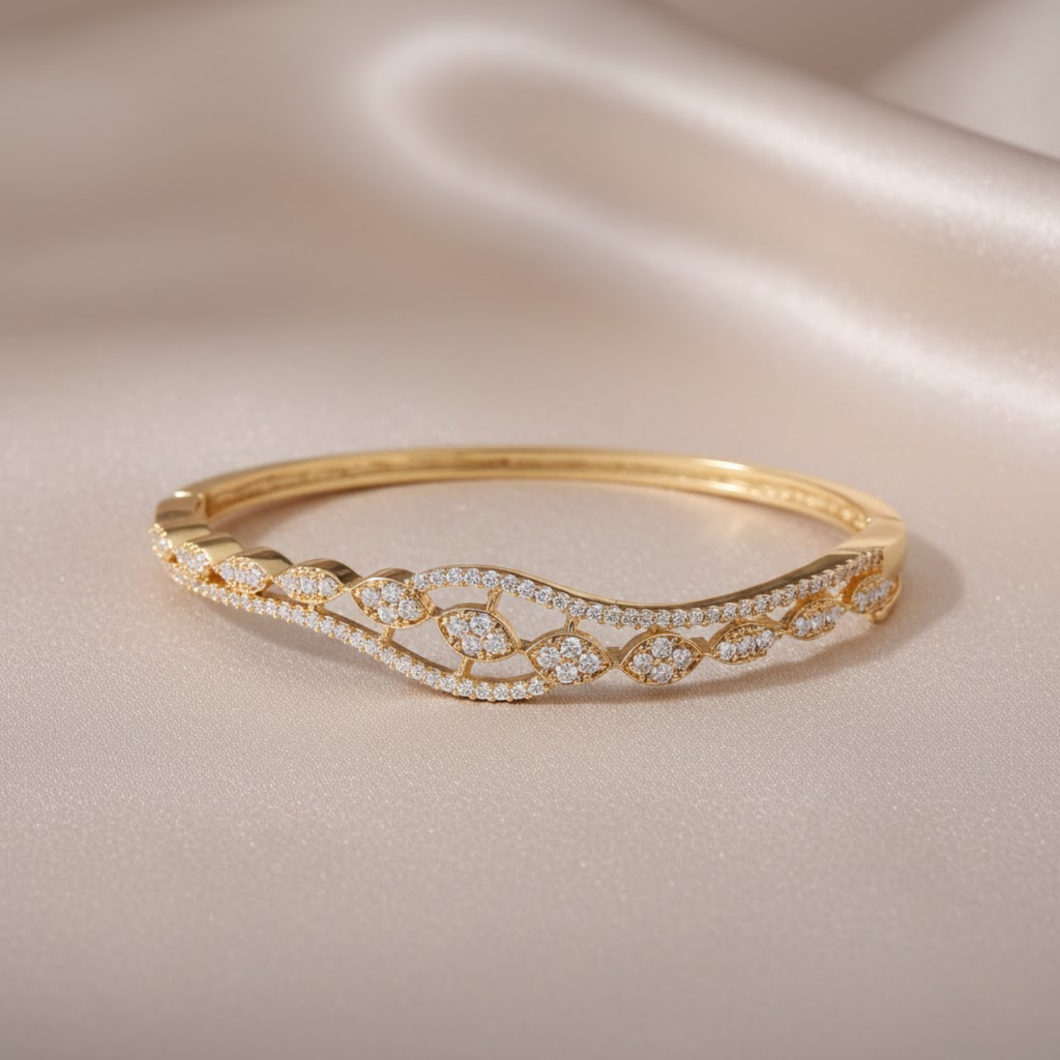 Adorn Your Wrist With The Unmatched Brilliance Of This Radiantly Crafted Golden Brass Bangle From 2wist Designs. This Modern Masterpiece Is Made From High Quality Brass Metal With Premium Golden Plating Featuring A Sophisticated Fluid Wave Silhouette. The Design Showcases A Radiant Sequence Of Diamond Shaped Settings Meticulously Pavé Set With Numerous Shimmering Diamond Color Cubic Zirconia Stones.