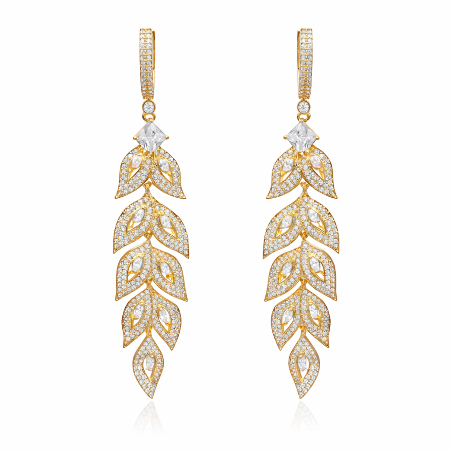 Grace Your Ears With The Unmatched Brilliance Of These Dazzlingly Crafted Golden Brass Drop Earrings From 2wist Designs. This Modern Masterpiece Is Made From High Quality Brass Metal With Premium Golden Plating Featuring A Sophisticated Multi Tiered Floral Motif. Each Earring Showcases A Grand Sequence Of Five Graduated Leaf And Petal Settings Meticulously Pavé Set With Numerous Shimmering Diamond Color Cubic Zirconia Stones.