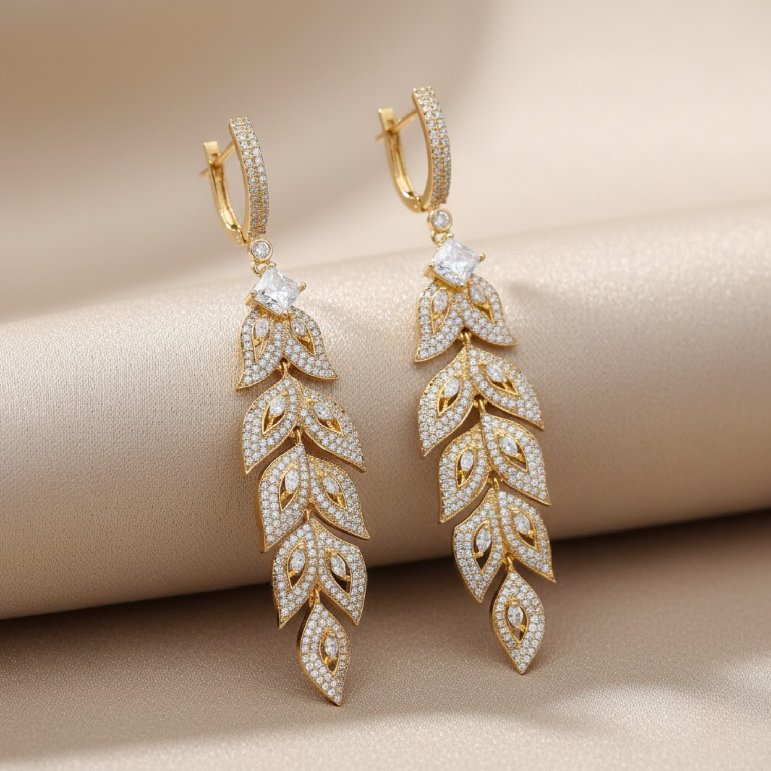 The Intensive Stone Work Utilizes A Precision Pavé Setting Where Small Brilliant Stones Are Placed Closely Together To Create A Continuous Surface Of Dazzling Sparkle That Captures The Light From Every Angle. A Stunning Princess Cut Accent Is Prong Set At The Top To Provide A Focal Point Of Exceptional Brilliance. These New Arrival Drop Earrings Are Designed To Be A Bold Statement Piece For Your Jewelry Collection Or A Meaningful Gift For Someone Special. The Elegant Organic Silhouette Complements Both Festive Ethnic Wear And Contemporary Evening Attire. Despite Their Ornate Craftsmanship And Extensive Stone Work These Earrings Are Engineered To Be Lightweight And Comfortable For All Day Wear.