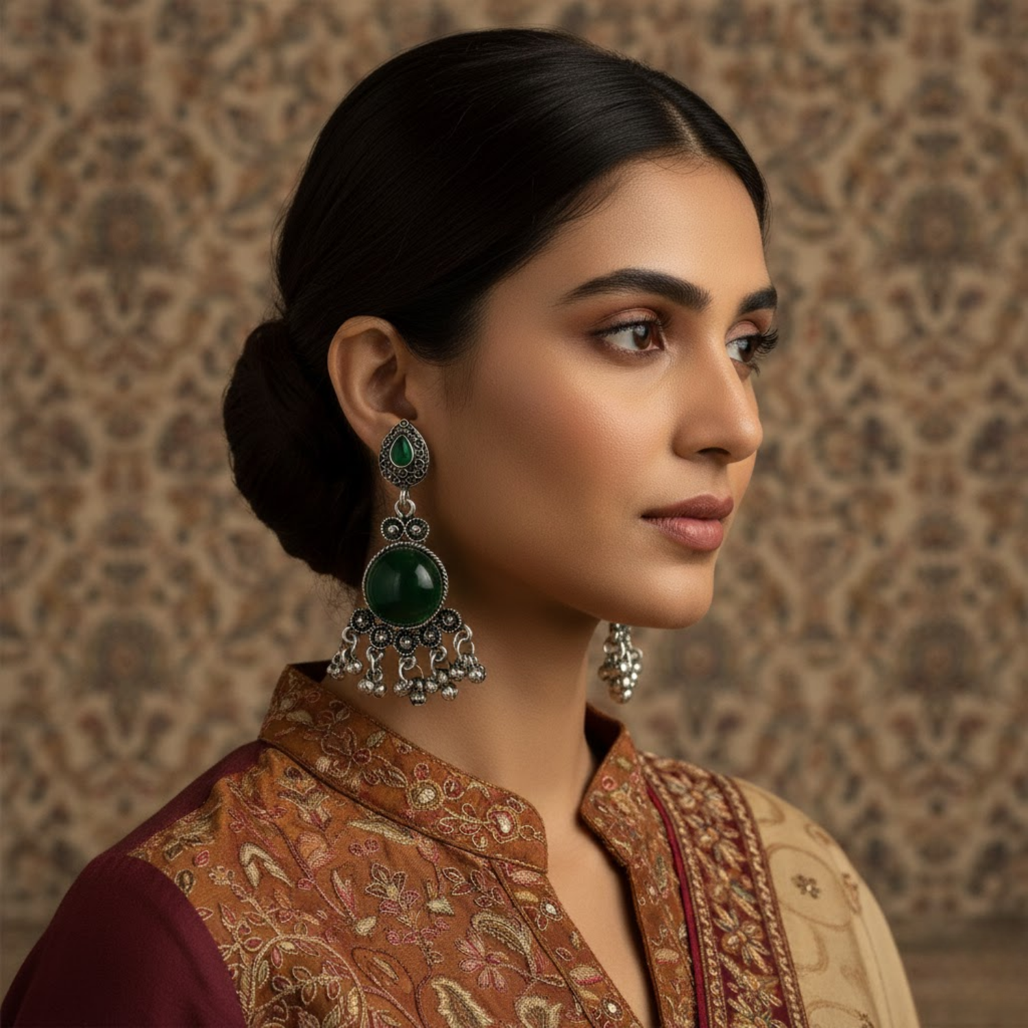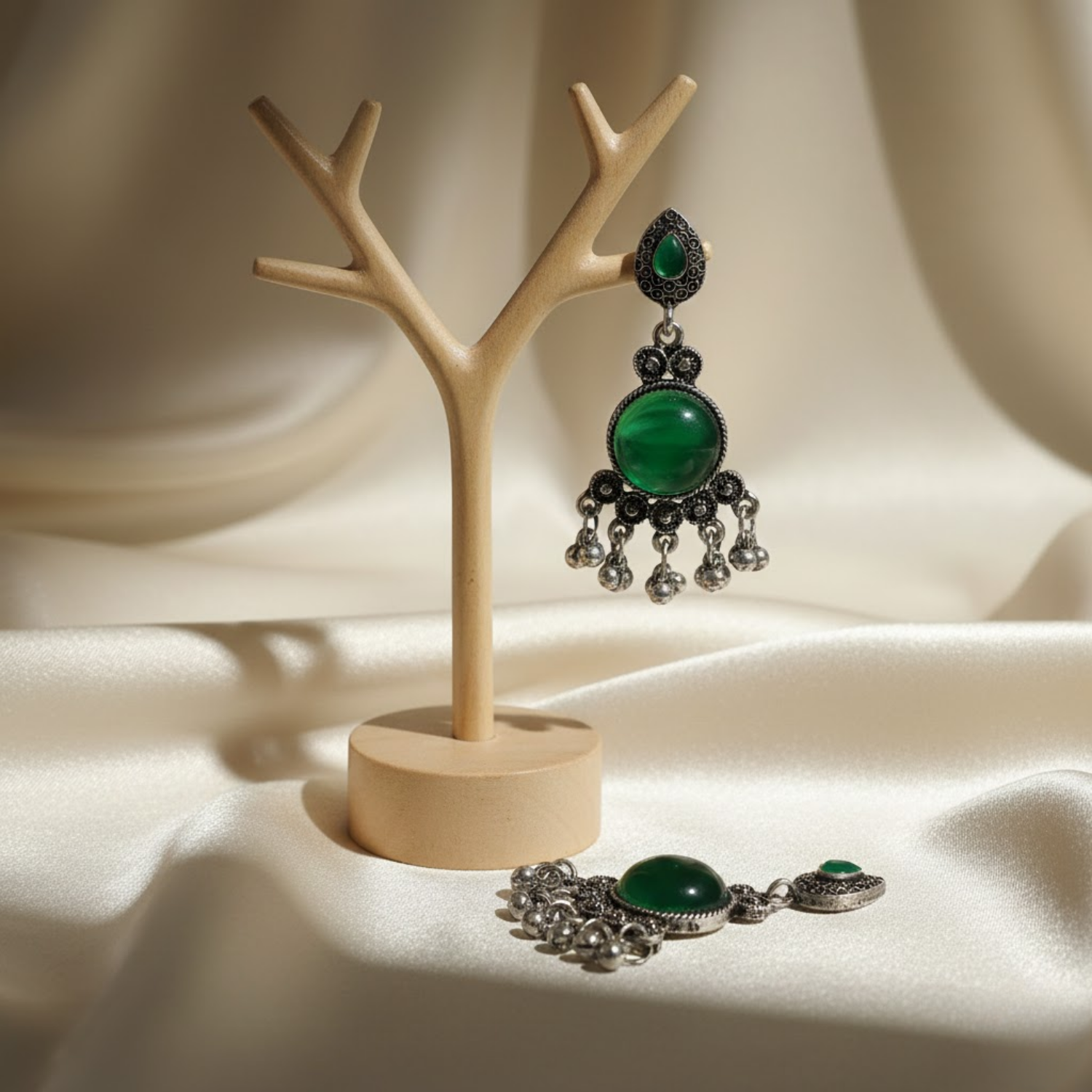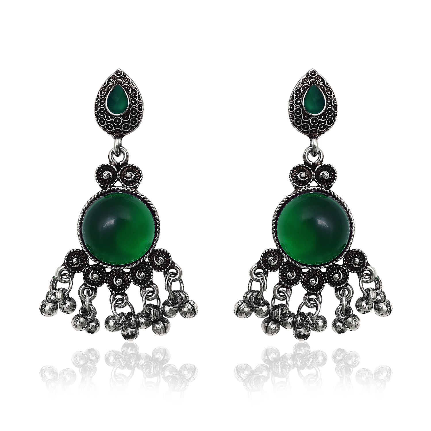 The Lower Half Of Each Earring Showcases A Bold Circular Silhouette Meticulously Set With A Large Radiant Green Color Stone That Captures The Light Beautifully. The Design Is Finished With A Graceful Fringe Of Polished Silver Metallic Beads That Add Traditional Tribal Charm And Create A Beautiful Sway With Every Movement. These New Arrival Earrings Are Perfect For Festive Occasions Cultural Gatherings Or Adding A Touch Of Sophistication To Your Modern Fusion Outfits. Despite Their Detailed Artistry These Earrings Are Engineered To Be Lightweight And Comfortable For All Day Wear. Whether You Are Looking For A Meaningful Gift Or A New Masterpiece For Your Own Collection These Green Stone Oxidized Earrings Offer A High End Contemporary Aesthetic That Customers Value For Its Fine Craftsmanship.