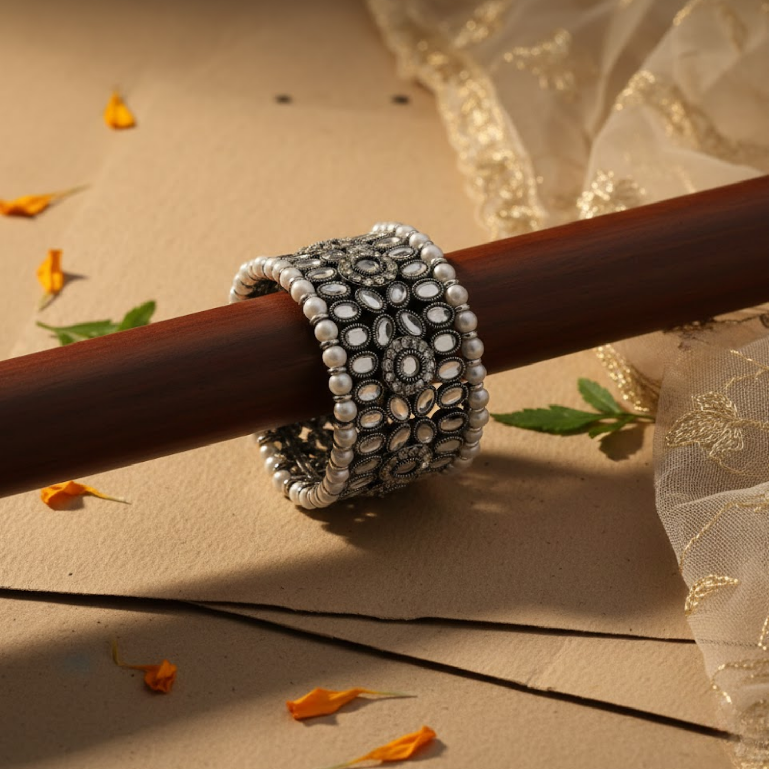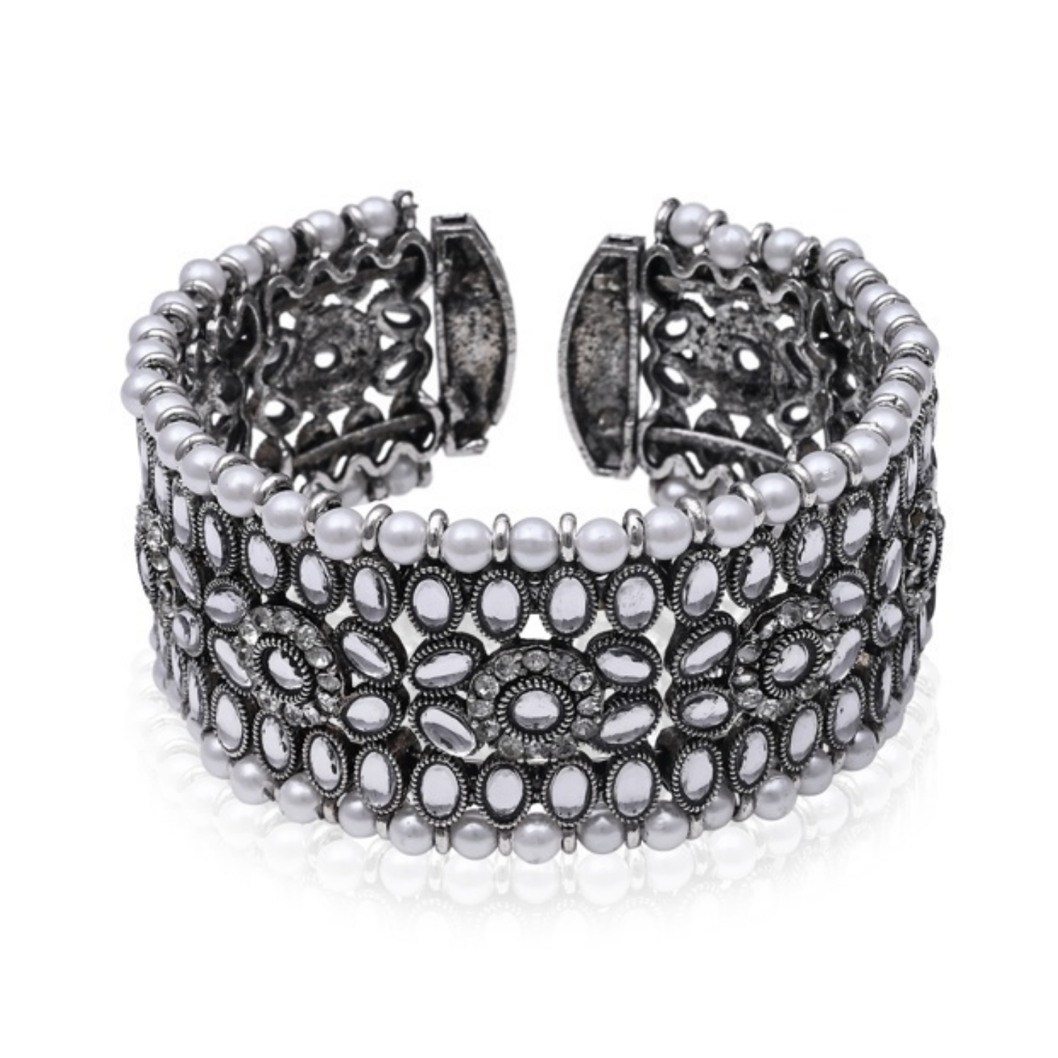 The Bracelet Is Beautifully Framed By Top And Bottom Borders Of Soft White Pearls That Add A Touch Of Timeless Sophistication. This New Arrival Bracelet Features A Secure Openable Hinge Design Allowing For An Easy And Adjustable Fit For Various Wrist Sizes. Whether You Are Dressing Up For A Wedding Festive Occasion Or Adding An Ethnic Touch To Your Modern Fusion Outfits This Pearl Accented Cuff Is The Perfect Choice. Despite Its Ornate And Detailed Appearance This Bracelet Is Engineered To Be Lightweight Enough For All Day Wear. Whether You Are Looking For A Meaningful Gift Or A New Masterpiece For Your Own Collection This White Stone Oxidized Bracelet Offers A High End Contemporary Aesthetic That Customers Value For Its Fine Craftsmanship.