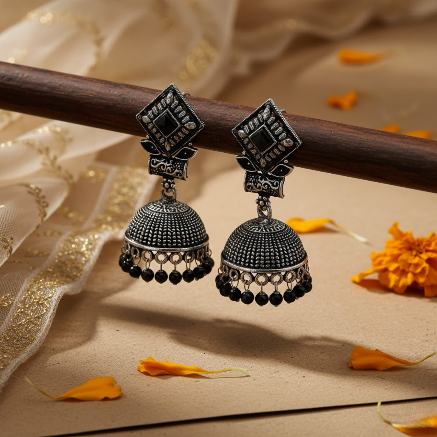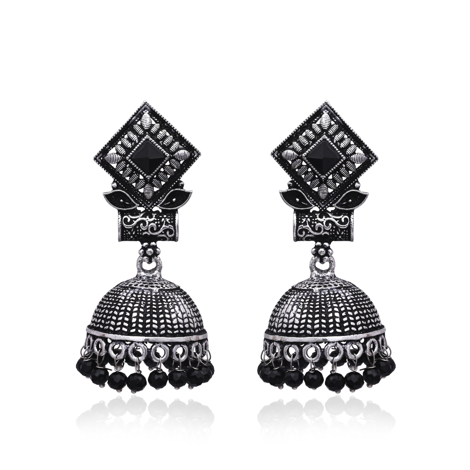 Make A Sophisticated Statement With These Stunning Oxidized Silver Plated Jhumka Earrings From 2wist Designs. These Elegant Earrings Are Crafted From High Quality Brass Metal With A Premium Oxidized Silver Finish For A Bold Antique Look. The Design Features A Striking Diamond Shaped Stud Adorned With A Deep Black Color Stone Center And Intricate Etched Borders.