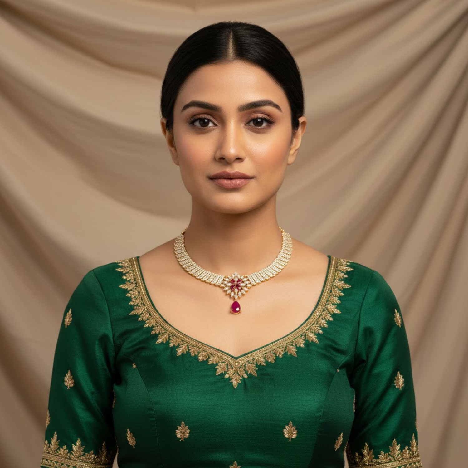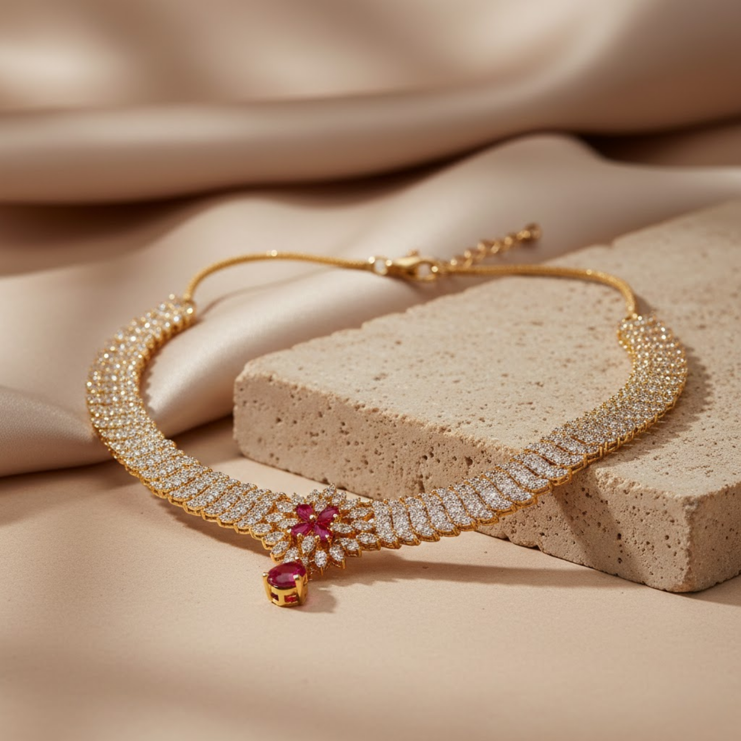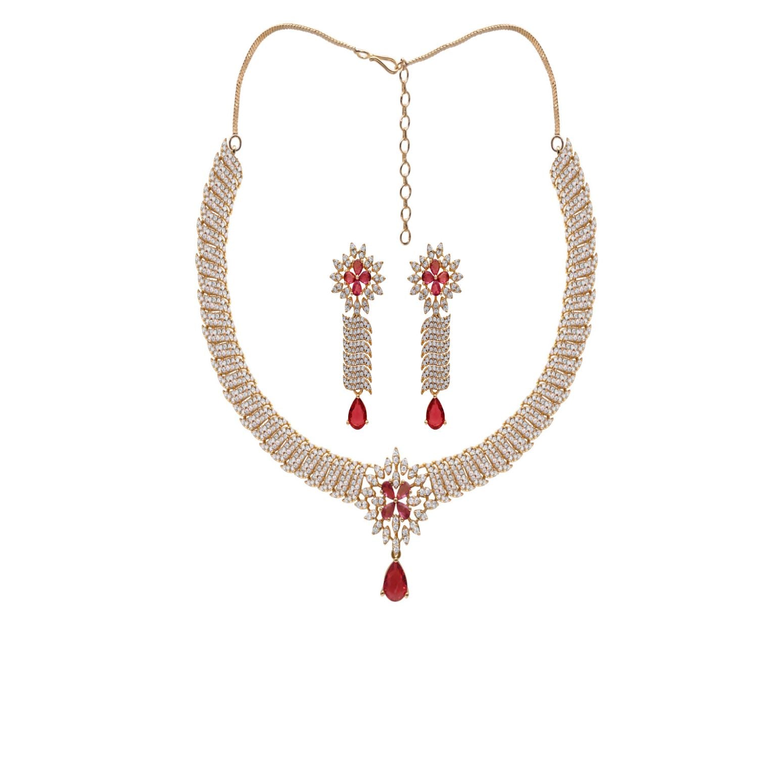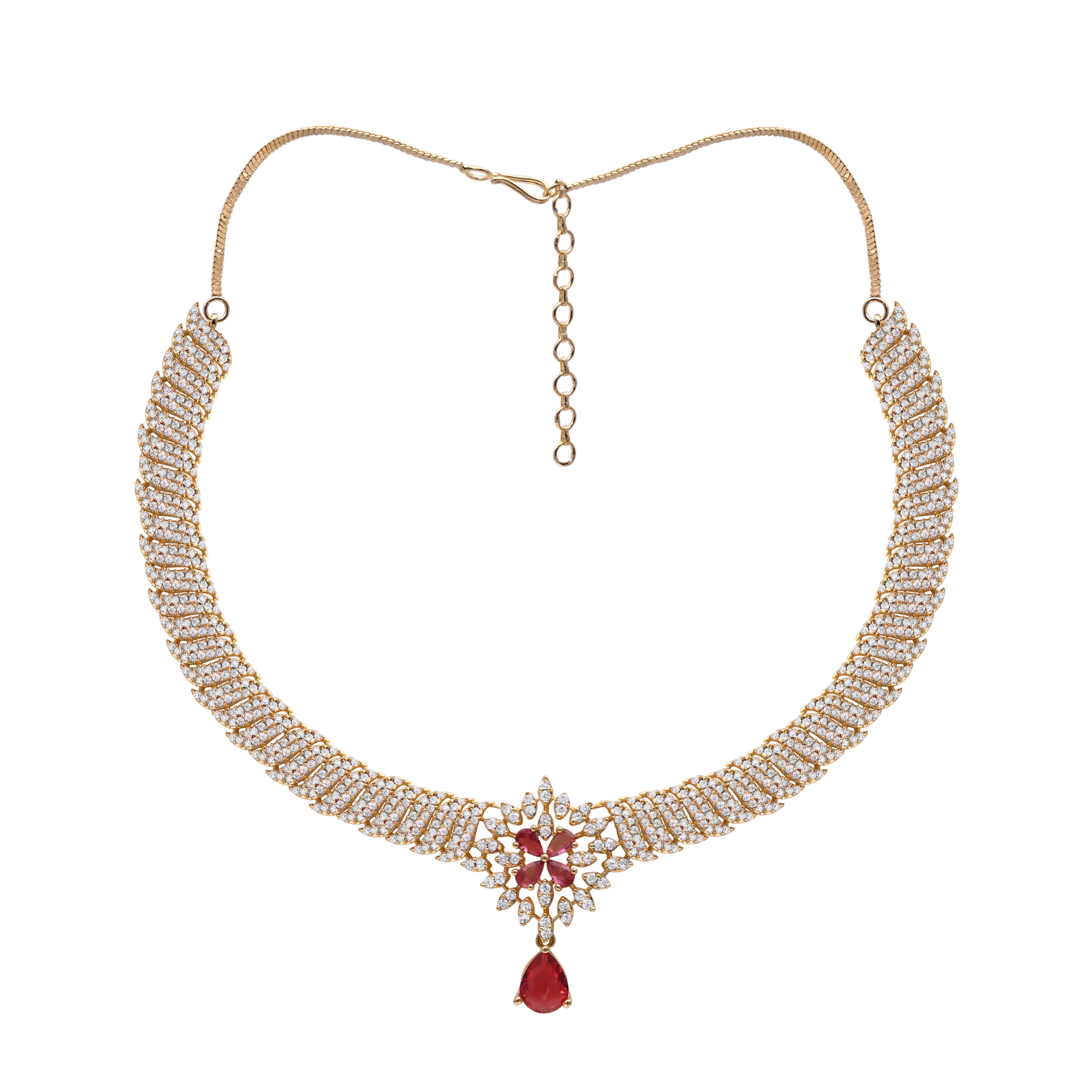 This New Arrival Choker Is Designed To Be A Versatile Statement Piece For Your Jewelry Collection Or A Meaningful Gift For Someone Special. The Intricate Pave Stone Work And Sophisticated Teardrop Dangle Offer A Modern Minimalist Aesthetic That Complements Both Festive Ethnic Wear And Contemporary Evening Attire. Despite Its Detailed Craftsmanship And Intensive Stone Work This Necklace Is Engineered To Be Lightweight And Comfortable For All Day Wear. Whether You Are Attending A Grand Celebration Or Looking For A New Hero Piece For Your Personal Style This Royal Ruby Style Choker Offers A High End Contemporary Aesthetic That Customers Value For Its Fine Craftsmanship.