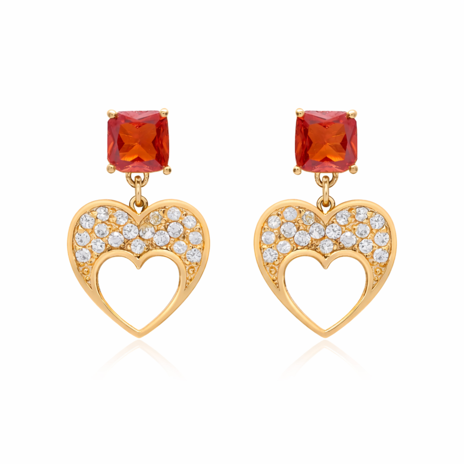 Capture Hearts With These Alluringly Crafted Golden Brass Earrings From 2wist Designs. This Modern Statement Piece Is Made From High Quality Brass Metal With Premium Golden Plating Featuring A Stunning Square Garnet Color Cubic Zirconia Stud That Radiates Deep Sophistication. The Design Transitions Into A Beautifully Detailed Openwork Heart Dangle Meticulously Adorned With A Cluster Of Shimmering Diamond Color Cubic Zirconia Stones.
