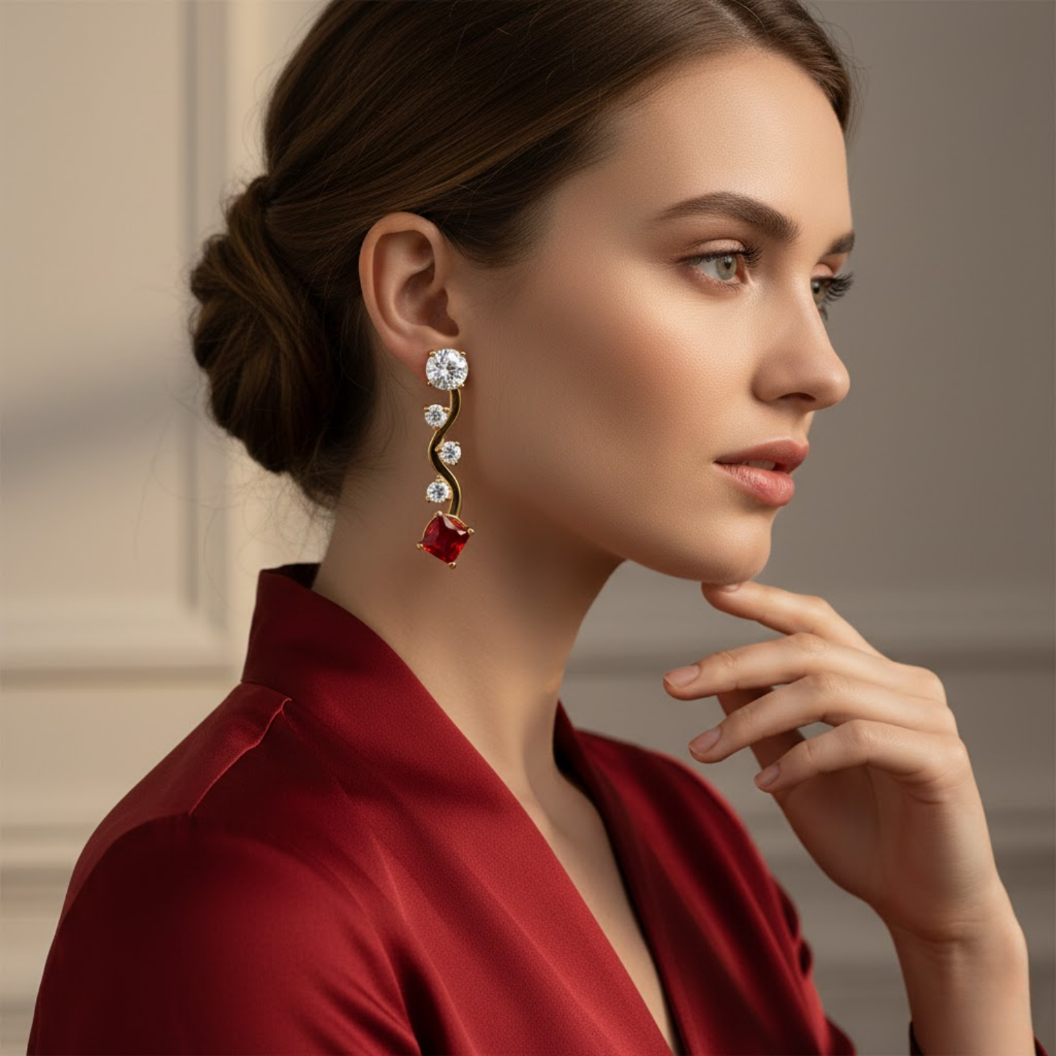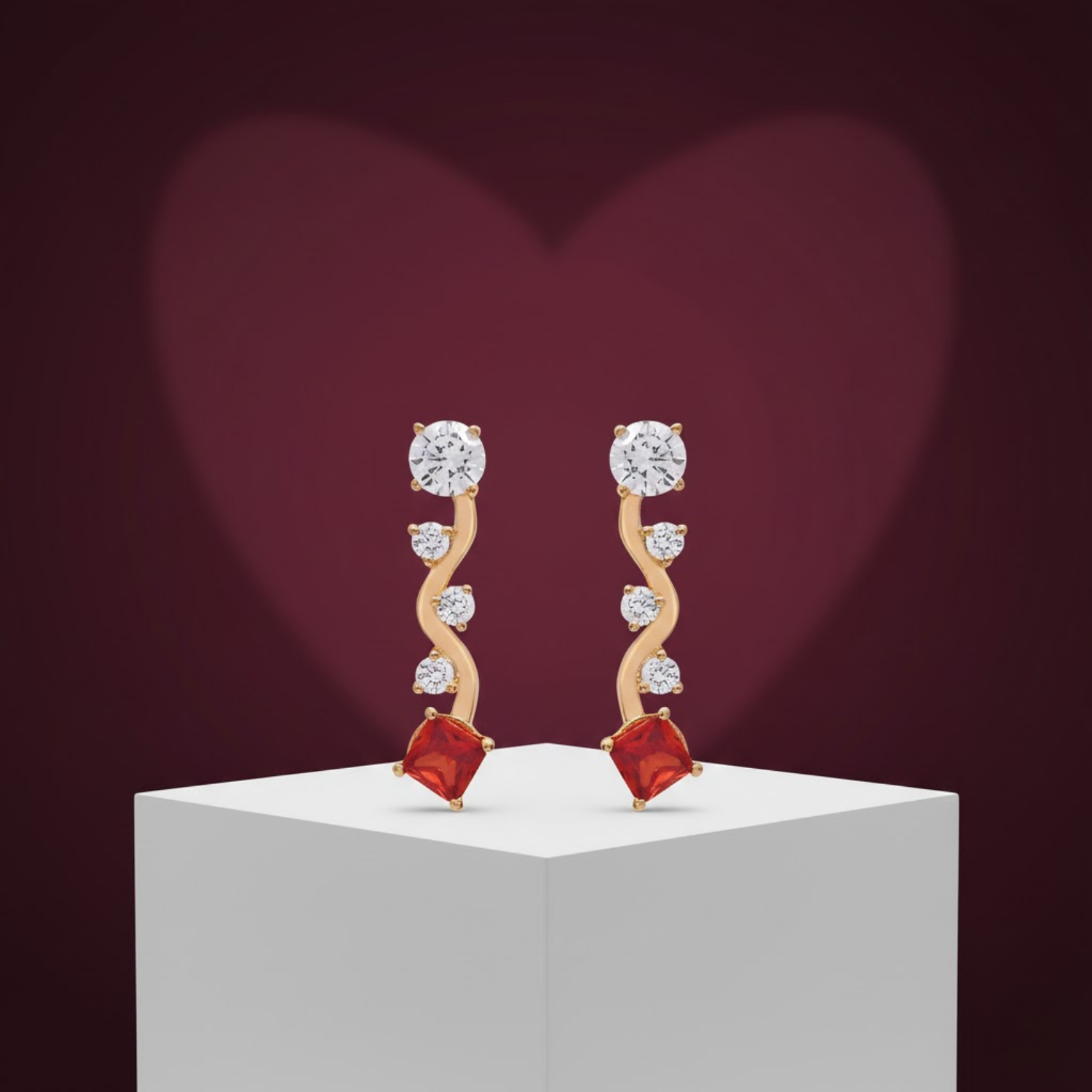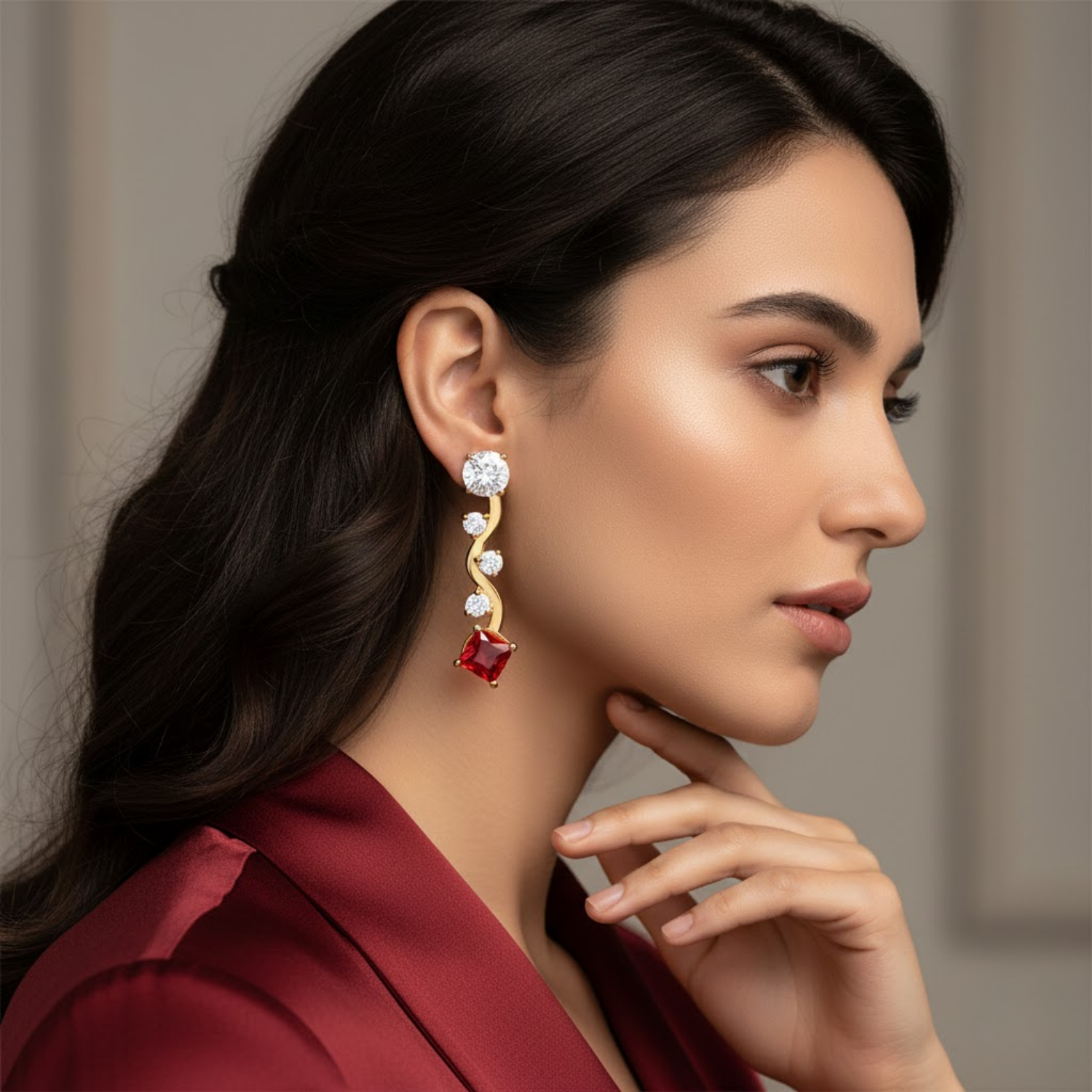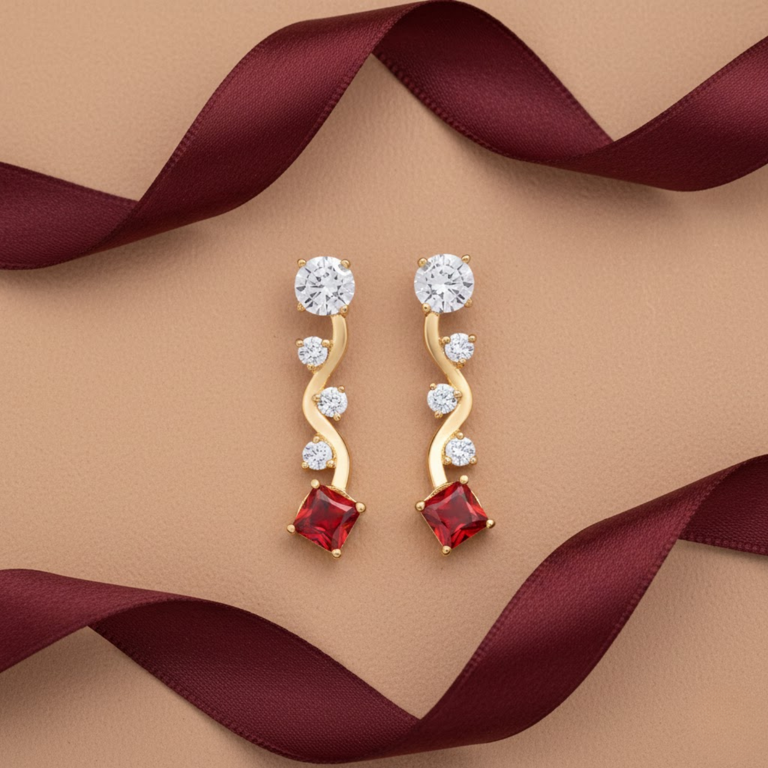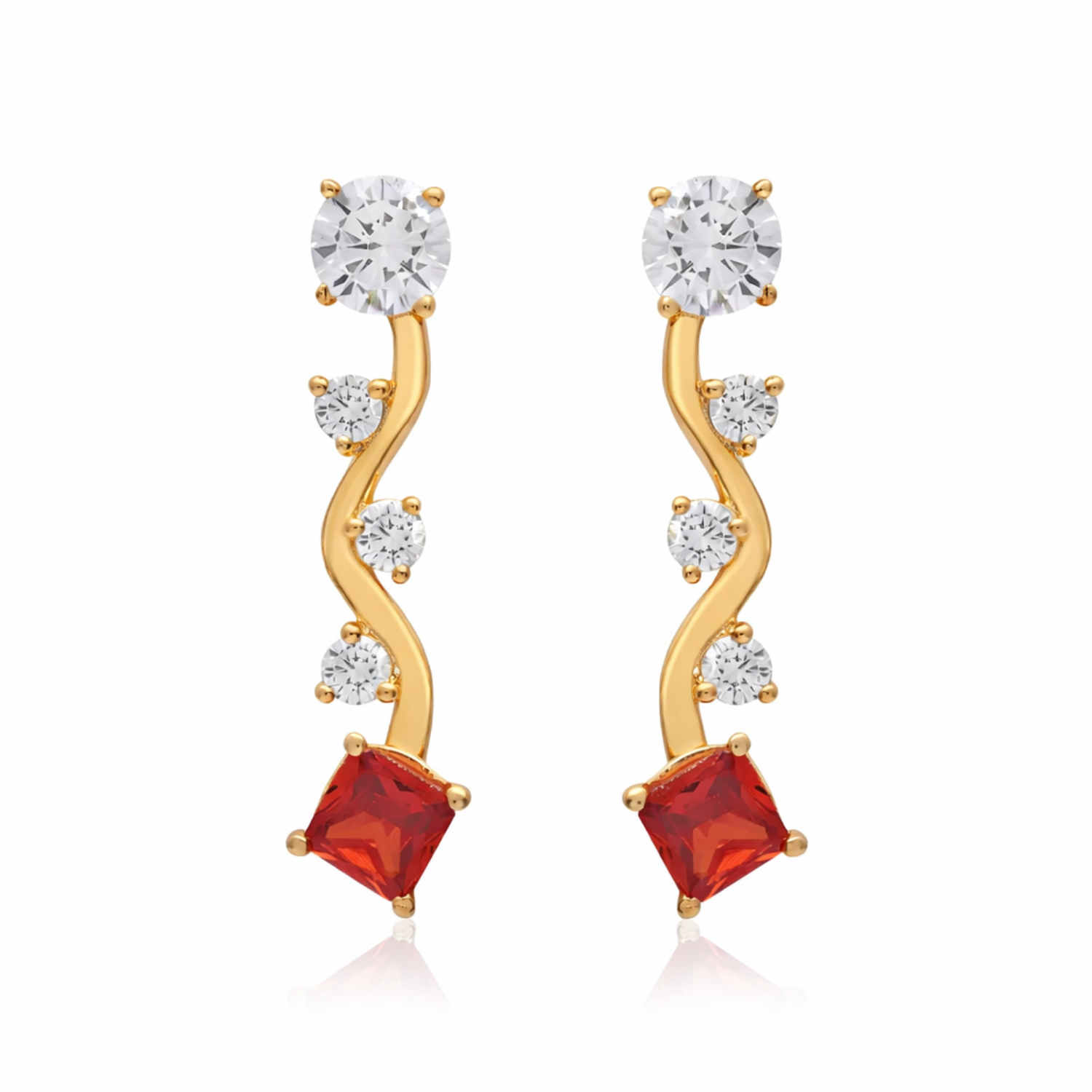 Elevate Your Jewelry Collection With These Alluringly Crafted Golden Brass S-Curve Earrings From 2wist Designs. This Modern Statement Piece Is Made From High Quality Brass Metal With Premium Golden Plating Featuring A Sophisticated Wave Silhouette. The Design Is Meticulously Set With Four Brilliant Diamond Color Cubic Zirconia Stones Of Varying Sizes That Sparkle Along The Curve Leading To A Stunning Vibrant Garnet Color Cubic Zirconia At The Base.