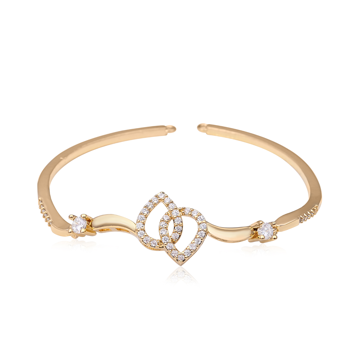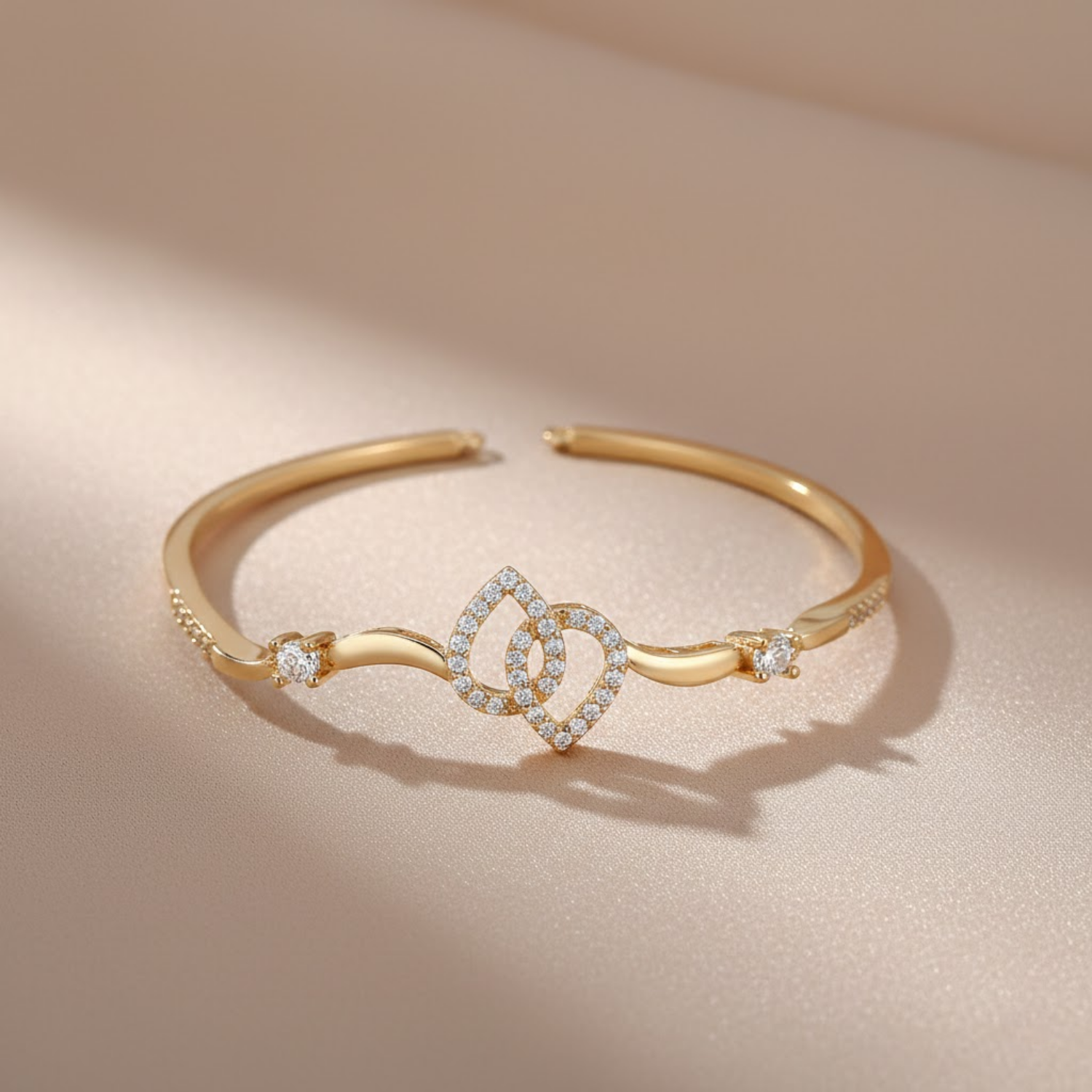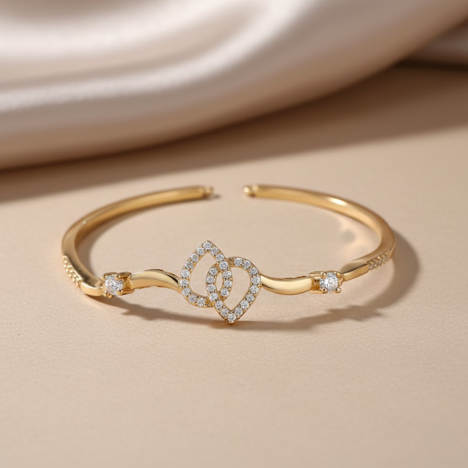Adorn Your Wrist With The Unmatched Brilliance Of This Enchantingly Crafted Golden Brass Bangle From 2wist Designs. This Modern Masterpiece Is Made From High Quality Brass Metal With Premium Golden Plating Featuring A Sophisticated Interlocking Silhouette. The Central Design Showcases Two Magnificent Intertwined Heart Motifs Meticulously Pavé Set With Numerous Shimmering Diamond Color Cubic Zirconia Stones To Capture The Light From Every Angle.