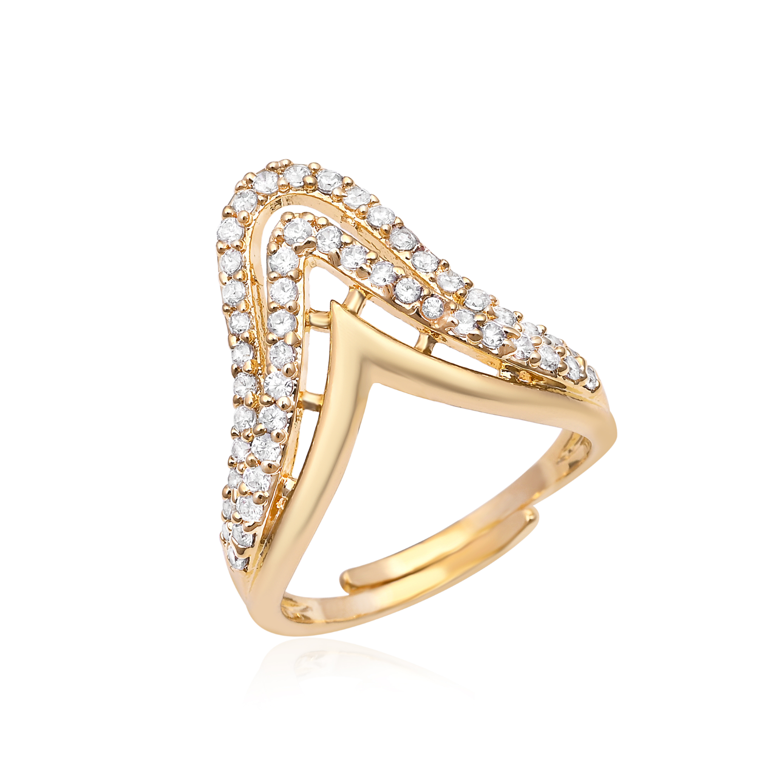 Elevate Your Style With The Timeless Elegance Of This Luxuriously Crafted Golden Brass V Shape Wishbone Ring From 2wist Designs. This Stunning Statement Piece Is Made From High Quality Brass Metal With Premium Golden Plating Featuring A Sophisticated Tiered Chevron Silhouette. The Design Is Meticulously Pave Set With Three Radiant Layers Of Shimmering Diamond Color Cubic Zirconia Stones That Capture The Light To Create A Dazzling Surface Of Brilliance.